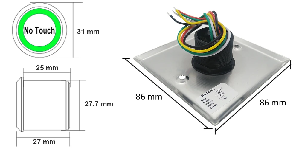 Материал датчика: пластик Панель: 201 панель из нержавеющей стали Водонепроницаемость: IP68 Контактная Оценка: 3A, AC 120V / DC 30V Входное напряжение: 12-24 В постоянного тока Выходной контакт: NO/NC/COM Рабочая температура (прибл.): от 0 до 50 ℃ Диапазон отклика: в пределах 10 см Светодиодный индикатор: Режим ожидания: синий светодиодный, приближение посетителей: зеленый светодиодный индикатор Размер K5 (приблизительно): 86x86x27 мм