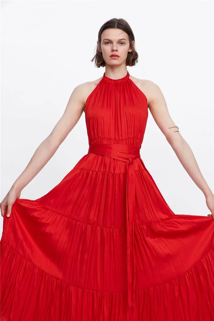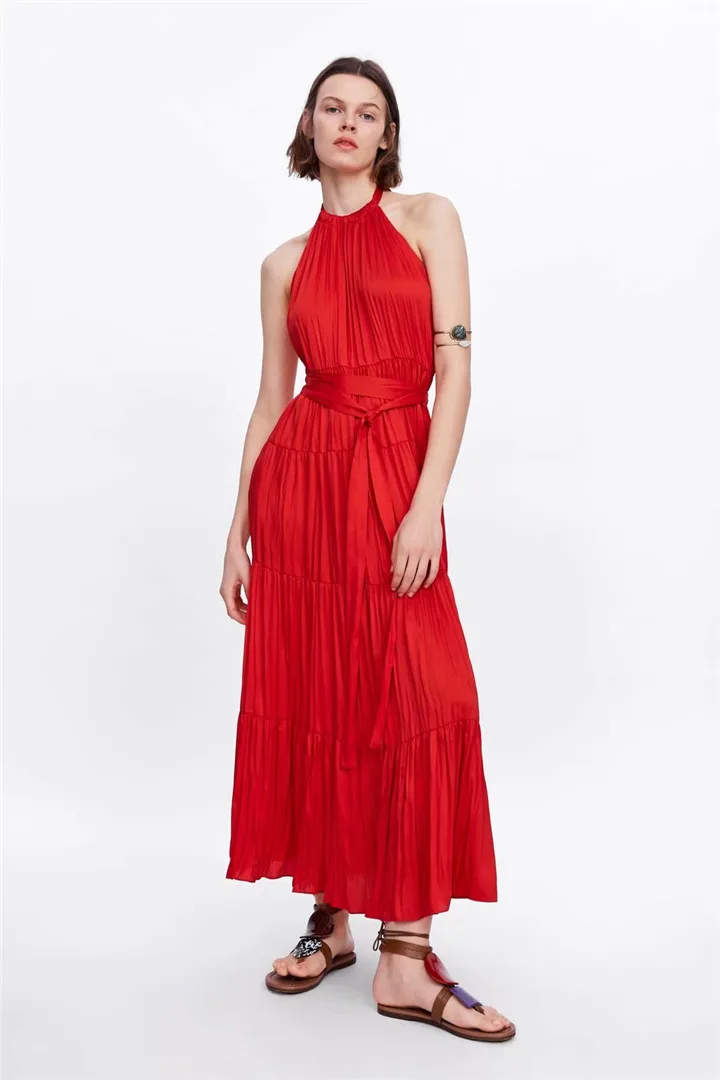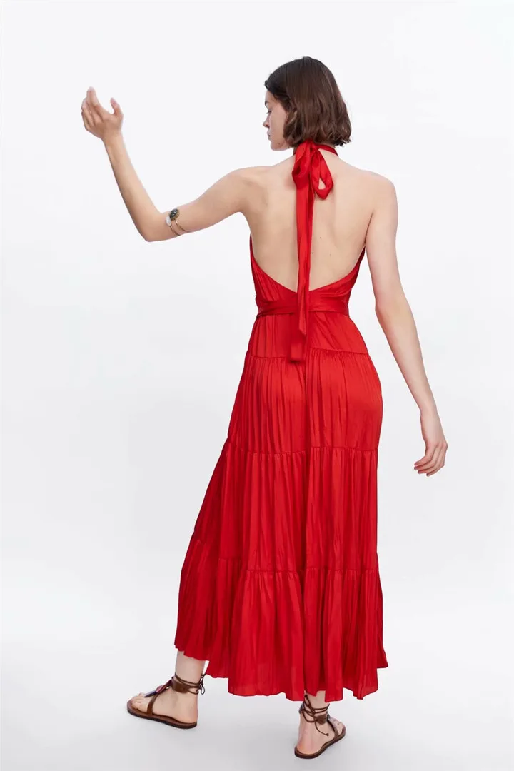 2020 женское летнее платье, однотонное Плиссированное длинное красное платье с открытой спиной и поясом, vestidos, Макси платья