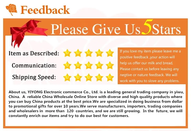 3. If you are a regular buyer, please give us 5 stars and provide positive feedback for your order. When you place a new order in our store. You can send a message to your new order and give us your latest order number. We are ready to give you gifts or some discounts.