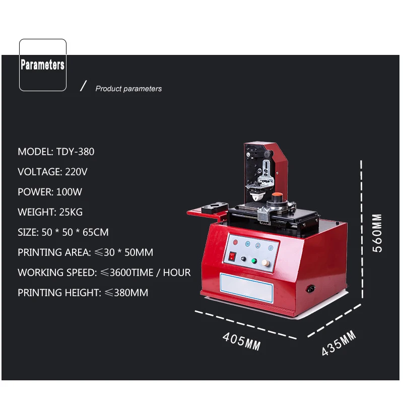 Напряжение: 220V Мощность: 100W Вес: 25 кг Размеры: 50*50*65 см Площадь печати: ≤ 30*50 мм Рабочая скорость: ≤ 3600 раз/час Высота печати: ≤ 380 мм Пожалуйста, имейте в виду, что: Все наши продукты отправляются из Китая, мы не несем ответственности за любые таможенные пошлины или налог на импорт, это ответственность покупателя