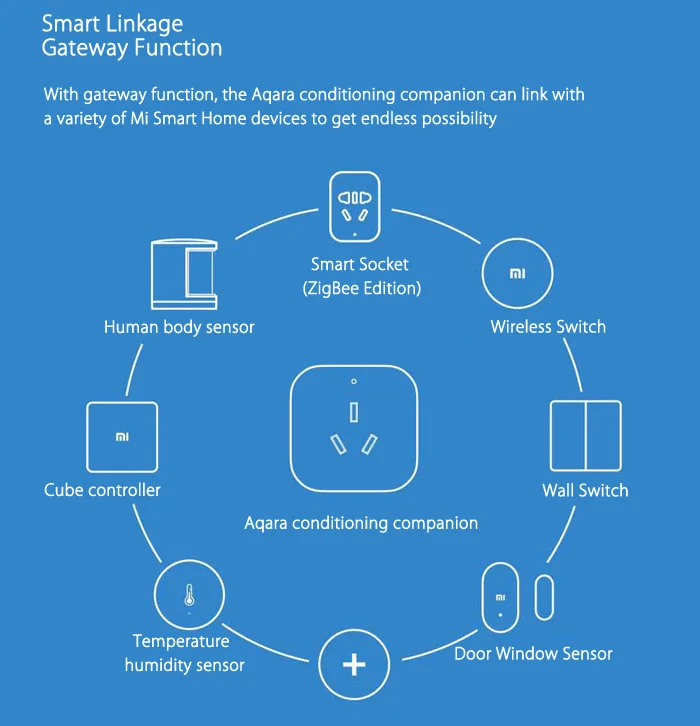 Основанный на технологии беспроводной передачи Wi-Fi и ZigBee, Компаньон по кондиционированию Aqara работает с вашим кондиционером через инфракрасные сигналы. Это центр управления домашними автоматическими устройствами ZigBee, который может работать со всеми датчиками и контроллерами ZigBee для реализации нескольких функций.