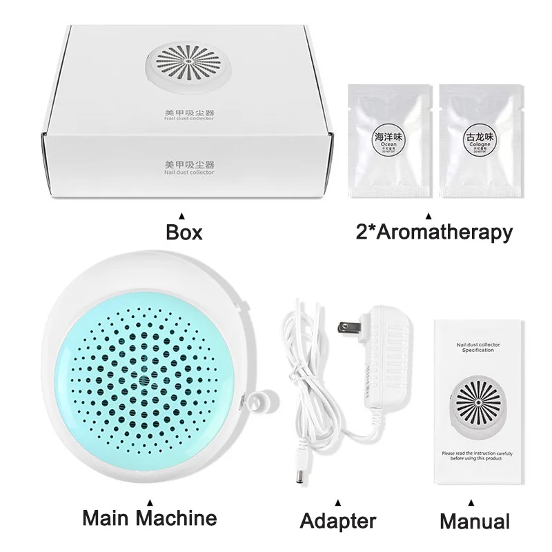 1. Тонкая работа с привлекательным внешним видом. 2. Прочный, привлекательный и чистый. 3. Сильный вентилятор для сбора пыли, создаваемой во время подачи или полировки ногтей. 4. С мощным и тихим двигателем, удобным в использовании. 5. Дизайн подушки, более удобный и более сильный опыт. 6. Запах аромата, очищает воздух. Можно выбрать океан и Кельн. 7. Подходит как для профессионального маникюрного салона, так и для личного использования. 8. Необходимый и профессиональный инструмент для дизайна ногтей.