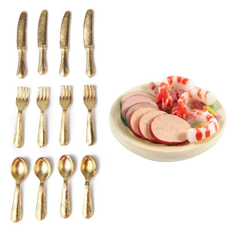 Набор посуды из нержавеющей стали 12 предметов золотой и 1:12 салат из морепродуктов на тарелке миниатюрный кукольный домик (разноцветный)