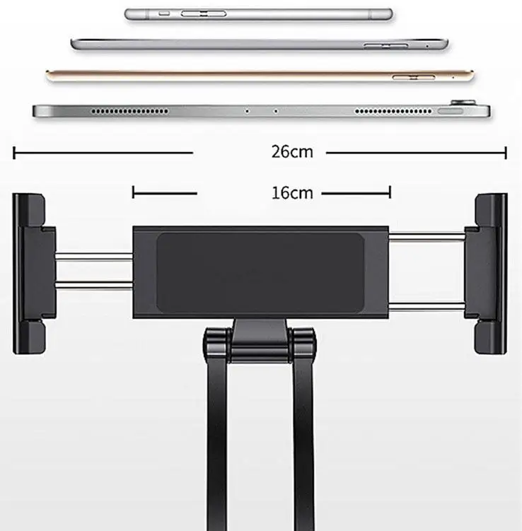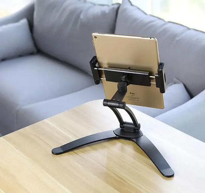 Изготовлен из алюминиевого сплава, прочный и стабильный. Основание кронштейна находится в форме внешней восьмерки, которая прочно поддерживается, чтобы предотвратить тряску. Кронштейн оснащен нескользящей Силиконовой прокладкой для защиты планшета и мобильный телефон.