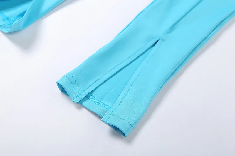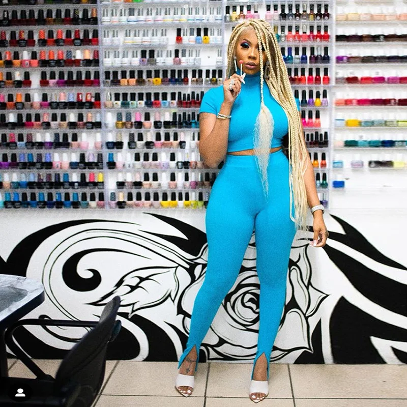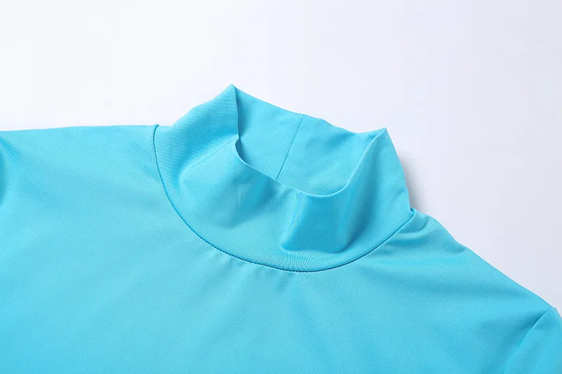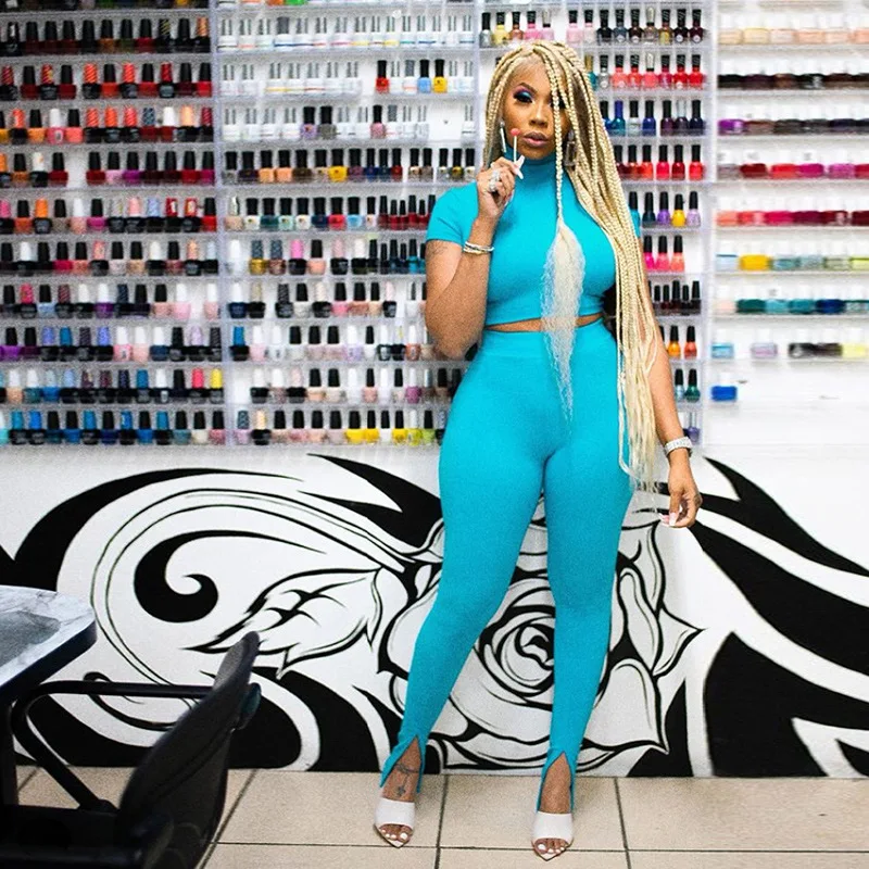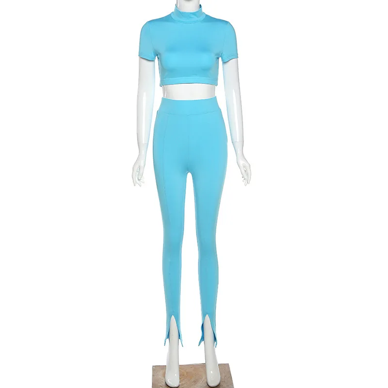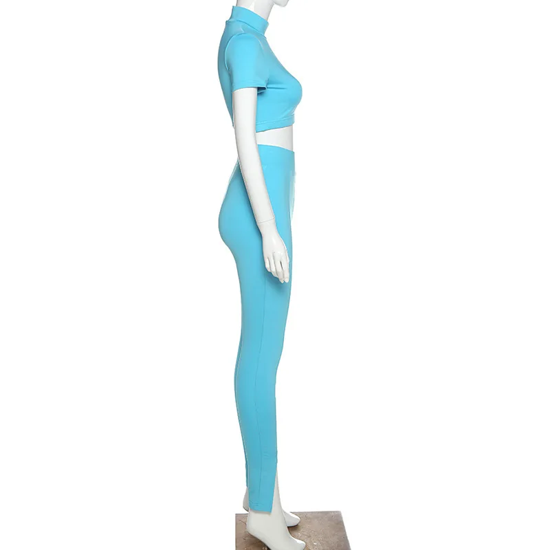 Женский спортивный костюм, синий комплект из двух предметов, укороченный топ с коротким рукавом, леггинсы с высоким воротом, спортивные обтягивающие повседневные уличные наряды