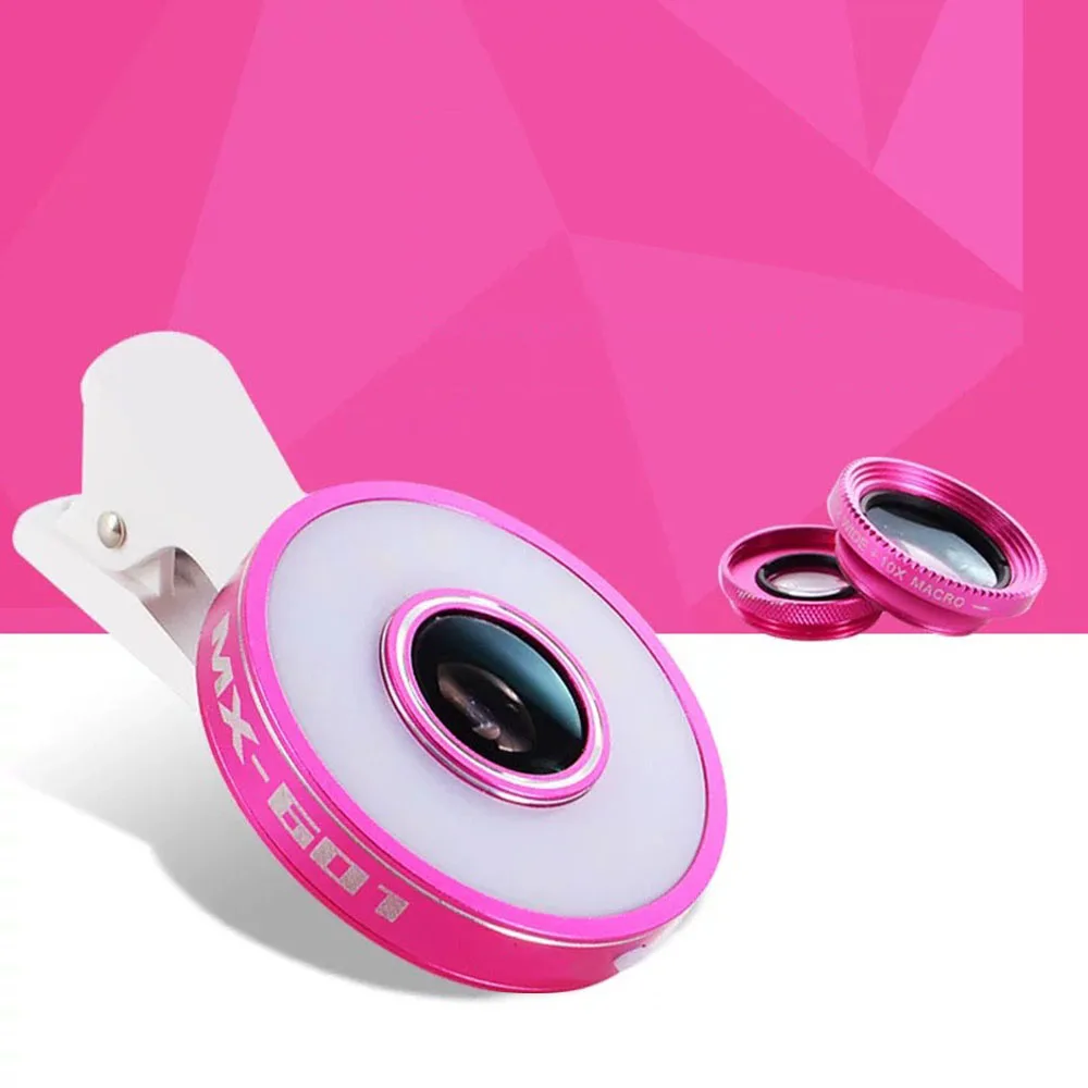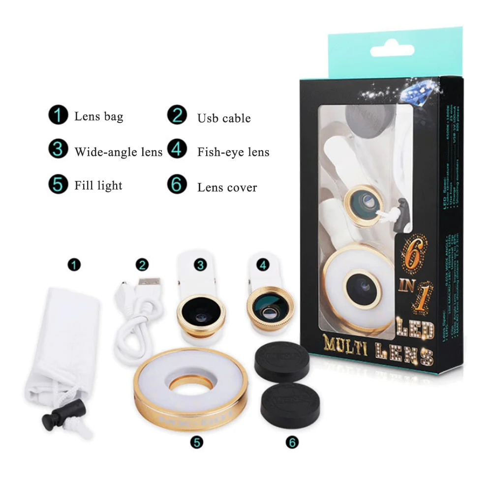 Заполняющий свет 6 в 1 имеет 3 режима освещения, широкоугольный объектив, макро-объектив и объектив «рыбий глаз», теряя свои различные потребности. Легко прикрепить телефон для удобного использования.