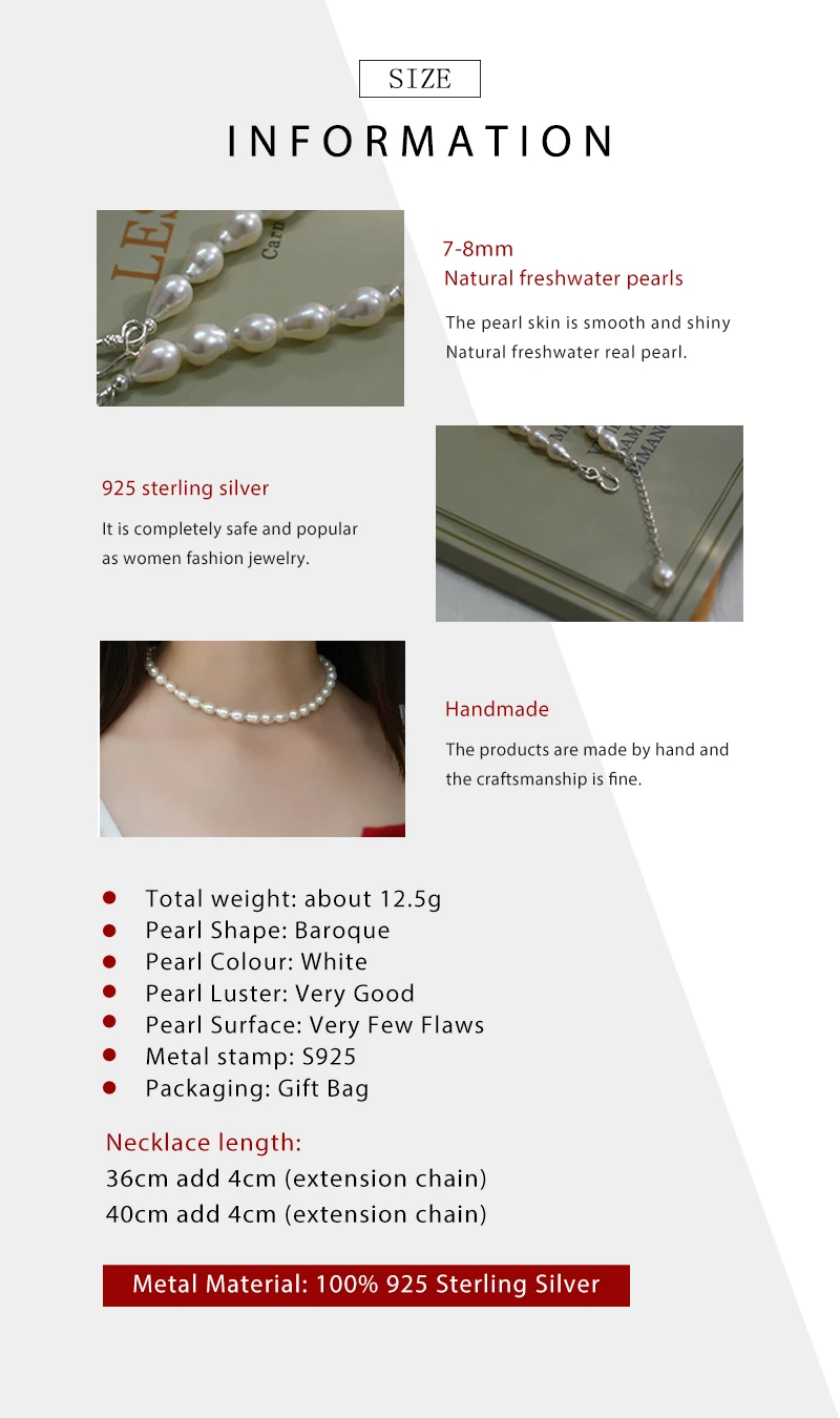 Бренд: ASHIQI Тип камня: натуральный пресноводный жемчуг Общий вес: около 12,5 г Жемчуг Форма: барокко Жемчуг Цвет: белый Жемчужный Блеск: очень хорошо Поверхность жемчуга: очень несколько недостатков Размер жемчуга: 7-8 мм Длина ожерелья: 36 см добавить 4 см (удлинительная цепь) Материал металла: 100% 925 пробы Серебряный Металлический штамп: S925 Упаковка: подарочный пакет