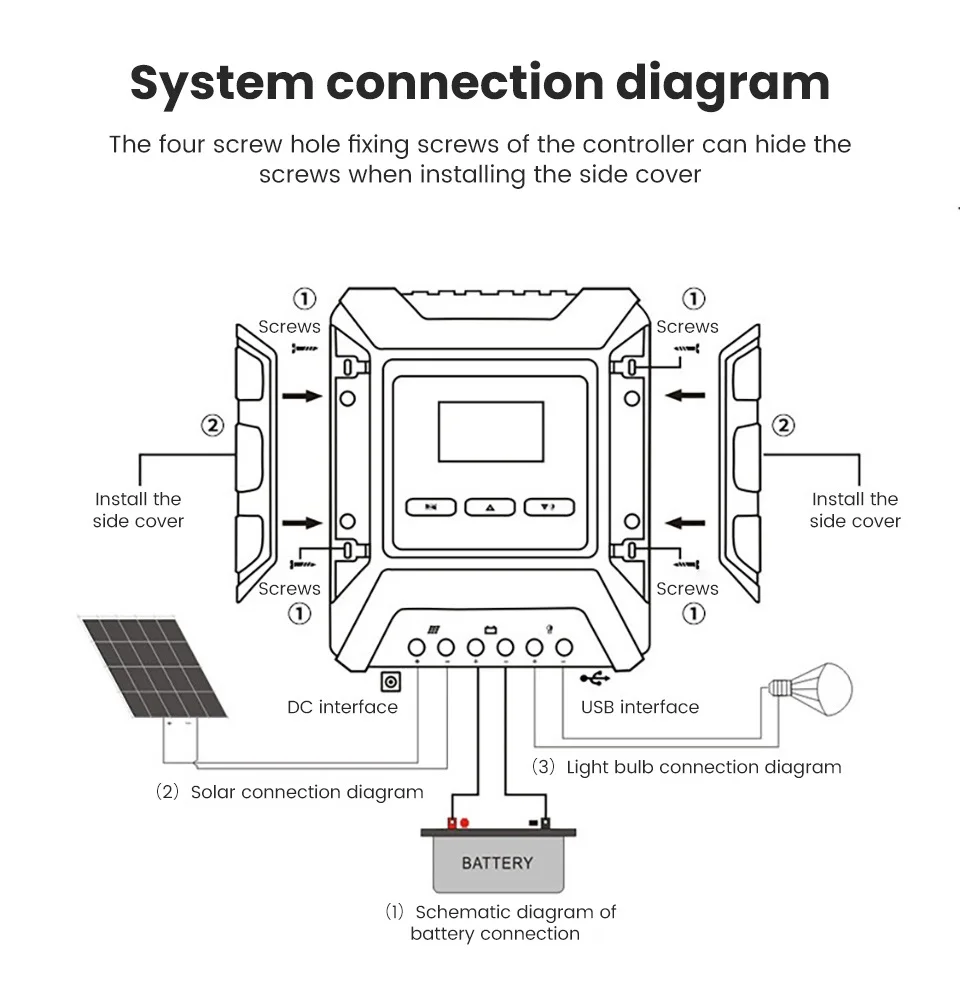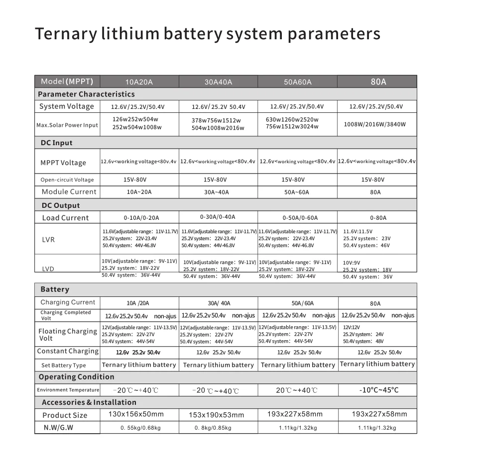 * Устройства индуктивной нагрузки не могут быть подключены к контроллеру* Максимальное напряжение панели PV не должно превышать 80 в, в противном случае контроллер будет поврежден.* 12 В система: подходит только для 3 серии тройных литиевых батарей, т. Е.Номинальное напряжение батареи 11,1 В; Подходит только для 4 серий литий-железаФосфатные батареи, т. Е. Номинальное напряжение батареи 12,8 В* 24V система: только в том случае, подходит для детей в возрасте от 6 серии тройных литиевые батареи, например,Номинальное напряжение аккумулятора 22,2 в; Подходит только для 8 серийЛитиевые железные фосфатные батареи, т. Е. Номинальное напряжение батареи25,6 В* 48V система: только в том случае, подходит для детей возрастом от 12 серии тройных литиевые батареи, например, Номинальное напряжение аккумулятора 44,4 в; Подходит только для 16 серийЛитиевые железные фосфатные батареи, т. Е. Номинальное напряжение батареи51,2 вПредупреждение если вы не выполните вышеуказанную операцию, не используйтеАккумулятор в соответствии со спецификацией, повреждает контроллер или любой другойПроблема не имеет ничего общего с этим продуктом.Посылка:1 * MPPT контроллер солнечного заряда1 * Руководство пользователя