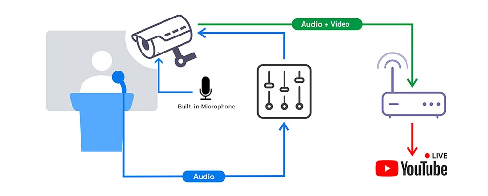 Прямая трансляция, RTMP видео и аудио потоковая передача на Youtube, Wowzar сервер для вещания с максимальным разрешением 4K видео и 48K частота дискретизации аудио AAC через беспроводную сеть.