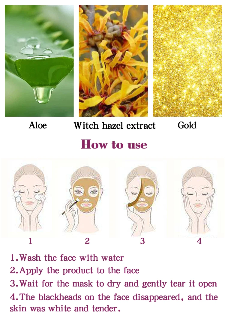 Содержит золотые ингредиенты, сотрудничая с различными питательными и косметическими ингредиентами, паста мягкая и деликатная, которая помогает очистить черную голову и грязь в пор, очистить отходы кутина и косметические остатки, И улучшает шероховатую, чистую мышцу, управляющее масло и тонкую кожу, Чтобы сделать кожу нежной и прозрачной.