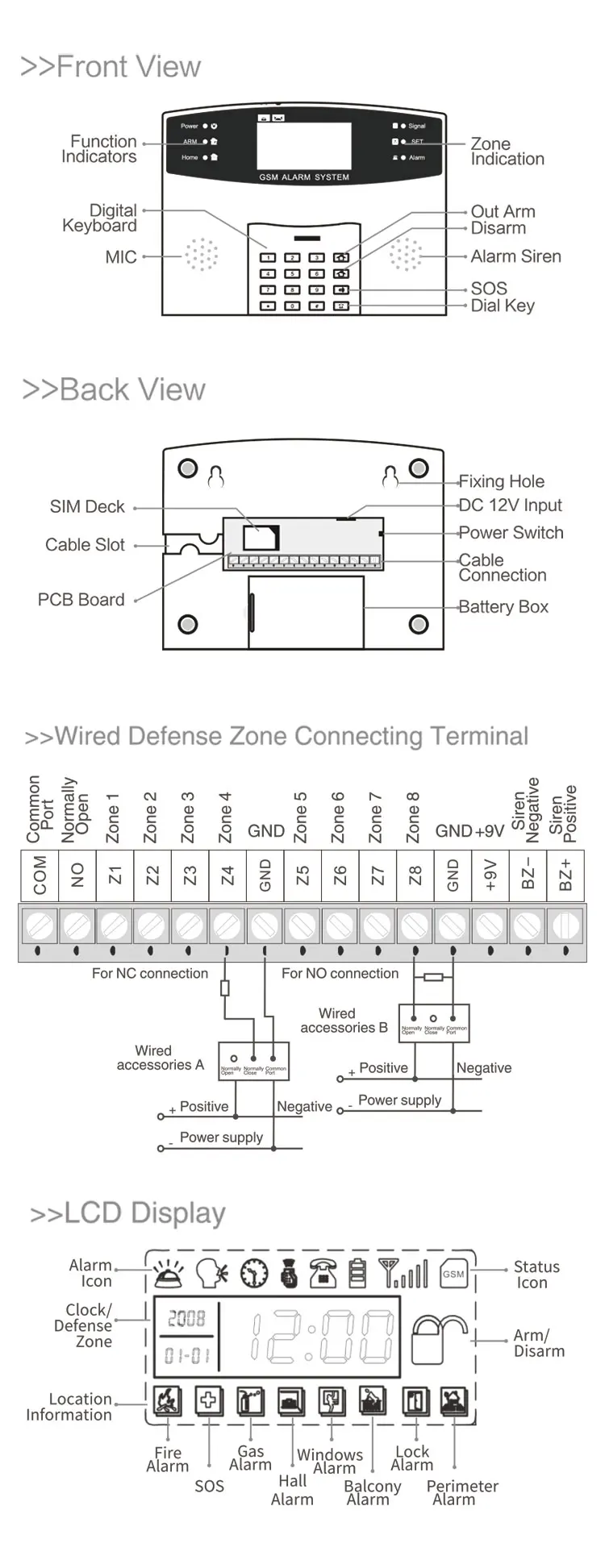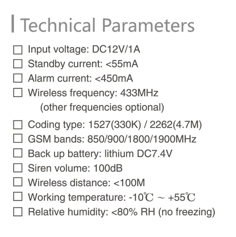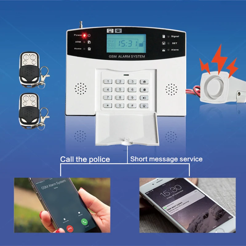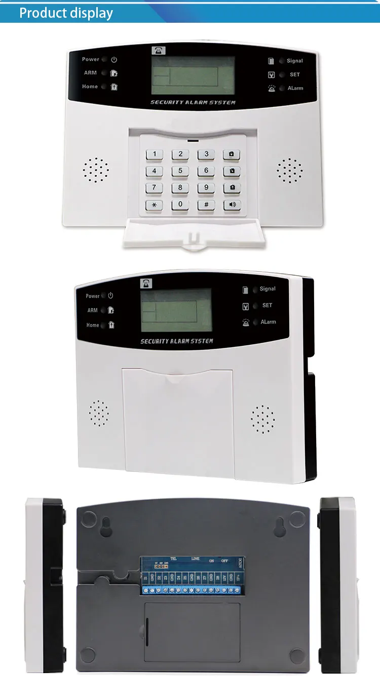 ▪99 беспроводных зон защиты, 8 проводных зон защиты ▪ЖК-дисплей со встроенными часами, интуитивно понятный и удобный ▪До обучения 5 беспроводные пульты дистанционного управления ▪Рычаг синхронизации и демонтаж, 1 группа рычага синхронизации, 1 группа рычага синхронизации ▪Предустановленная 6 групп будильников, хост автоматически набирает телефон, чтобы сделать голосовую сигнализацию ▪Предустановленный 2 группы SMS мобильный телефон номера, хост автоматически отправляет SMS на сигнал тревоги ▪Управление одной кнопкой, оружие, домашнее оружие, дистанционное вооружение, оружие вне места