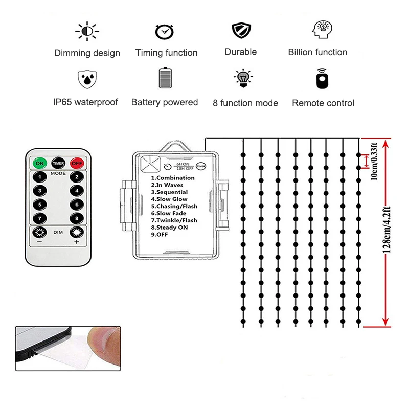 Питание от аккумулятора и пульт дистанционного управления: 3 батарейки АА (не входят в комплект). Расстояние дистанционного управления 16 футов. Пульт дистанционного управления может использоваться для настройки яркости, таймера или включения/выключения света. Эти мини светодиодные зонтичные гирлянды для патио имеют длину 128 см/4,2 фута на веревочку, декоративный зонтик для патио 7-10 дюймов