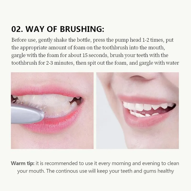 1. Сверхтонкая пена может быстро покрыть весь зуб, может быстро покрыть весь зуб, проникать глубоко в зубы, чтобы удалить пятна на зубах, улучшить здоровье полости рта и дышать