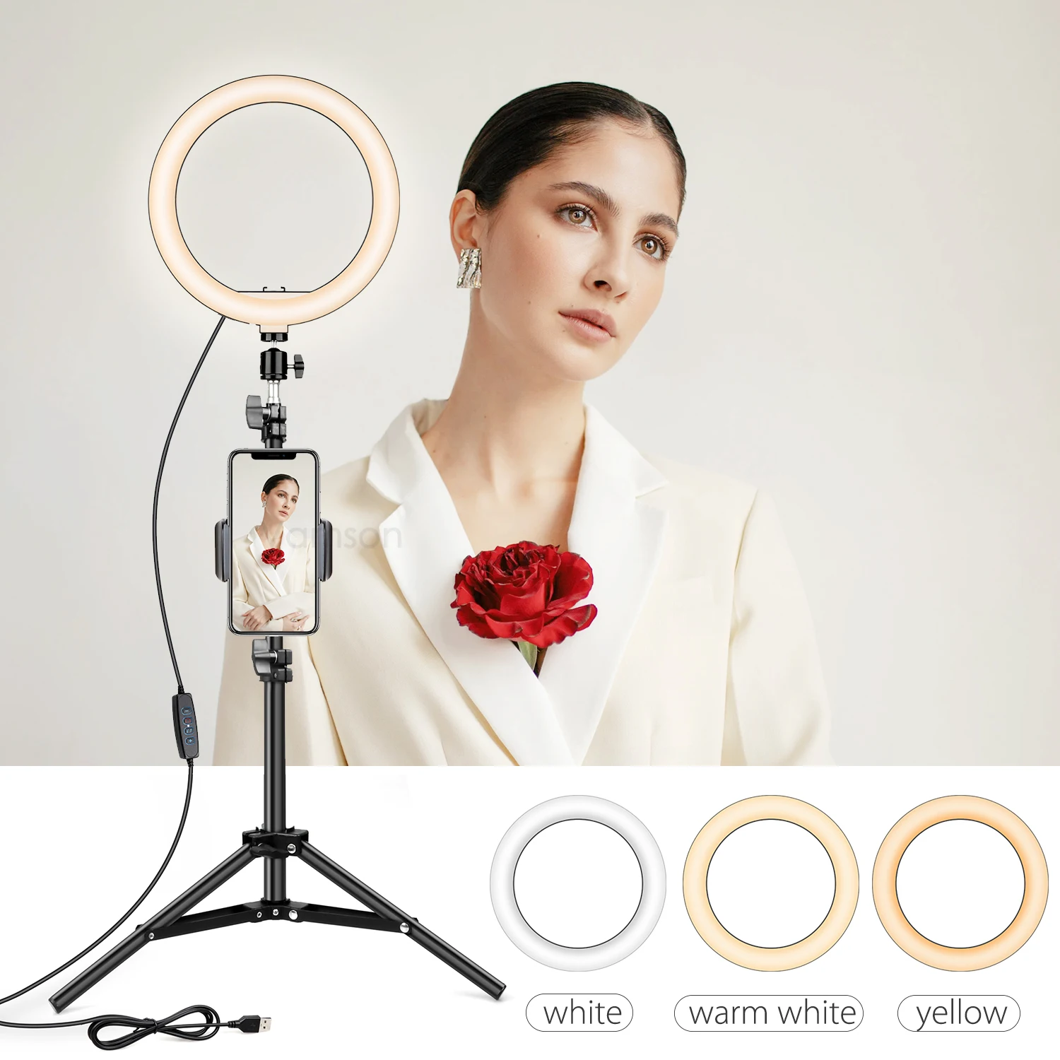 【Источник света 】: светодиодный 【Разъем: USB зарядка 【 3 цвета освещения Modes】: белый/теплый белый/желтый 【Уровень яркости 】: 11 для каждого цвета 【Варианты освещения 】: всего 33 【Цветовая температура: 3000K-6000K 【Наружный диаметр: 10 дюймов 【Dimmable】: Да 【Дальномер затемнения: 1%-100%