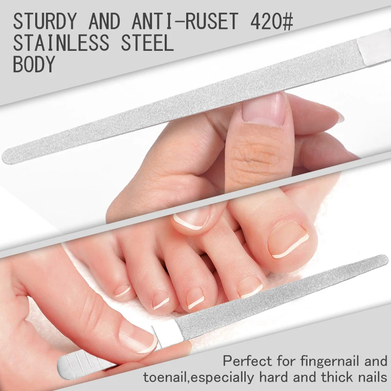 1. Качественный материал: Эти стальные пилки для ногтей изготовлены из нержавеющей стали с сапфировыми хлопьями, прочные и долговечные для длительного использования