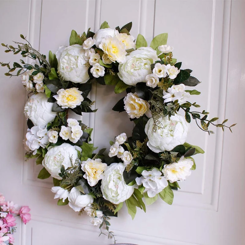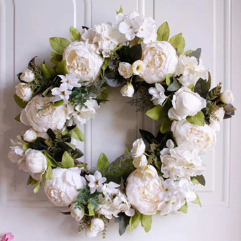 16-дюймовый венок из гортензии пиона, искусственный Венок с цветами пиона, дверной венок с зелеными листьями, весенний венок для передней двери, свадьбы