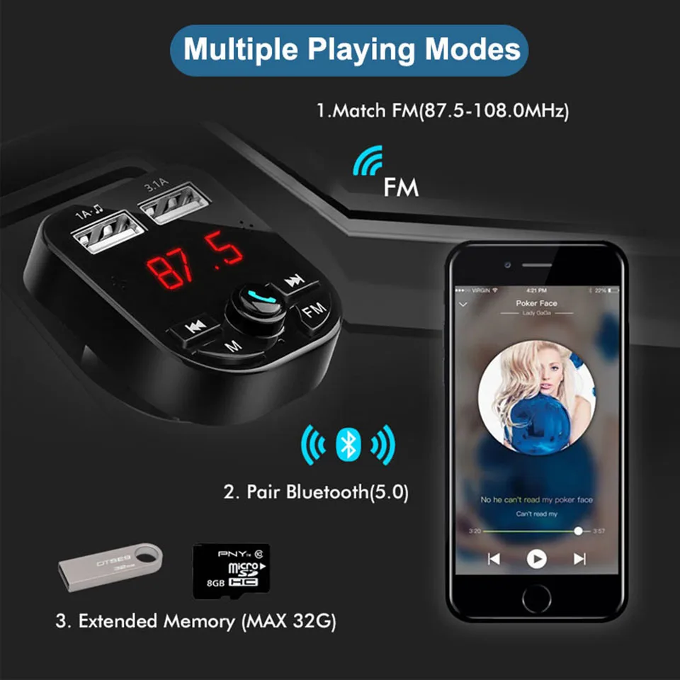 ※ Широкий диапазон и мульти-режимы воспроизведения: полный FM радиочастотный диапазон от 87,5 до 108,0 МГц шире, чем обычные fm-передатчики, поддержка Bluetooth/USB флэш-диска/tf-карты (MP3/wma)/ aux in, Антистатическая конструкция, Наслаждайтесь музыкой без потерь в вашем автомобиле, даже если ваш автомобиль старый. Поддержка прослушивания музыки во время зарядки и функция отключения памяти. Bluetooth fm-передатчик подходит для любого транспортного средства: Вход продукта: 12-24 В, подходит для любого автомобиля, грузовика, автобуса, пикап, RV,ORV .. нет необходимости тратить ваши деньги, чтобы купить так много fm-передатчиков, которые подходят для различных транспортных средств. Calling Hands Free вызов: можно ответить/повесить/отклонить/повторно набрать телефон через Bluetooth с помощью fm-передатчика. Fm-передатчик Bluetooth автоматический голосовой трансляции номер в соответствии с HD Blu-Ray цифровым дисплеем. Дважды нажмите на кнопку, можете набрать последний номер телефона. Aslo может регулировать уровень громкости. ※ Быстрая зарядка с двумя usb-портами: fm-передатчик для автомобильного радио поддерживает два электрических оборудования при одновременной зарядке. Usb-порт для зарядки 5V-2.1A может заряжать ваш телефон в течение короткого времени.