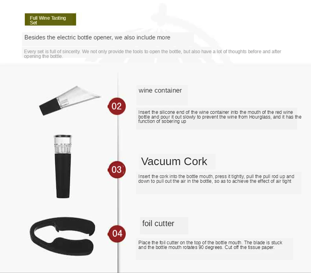 Упаковка: 1 Электрический Нож для вина, 1 фольга, 1 руководство пользователя на китайском и английском языках
