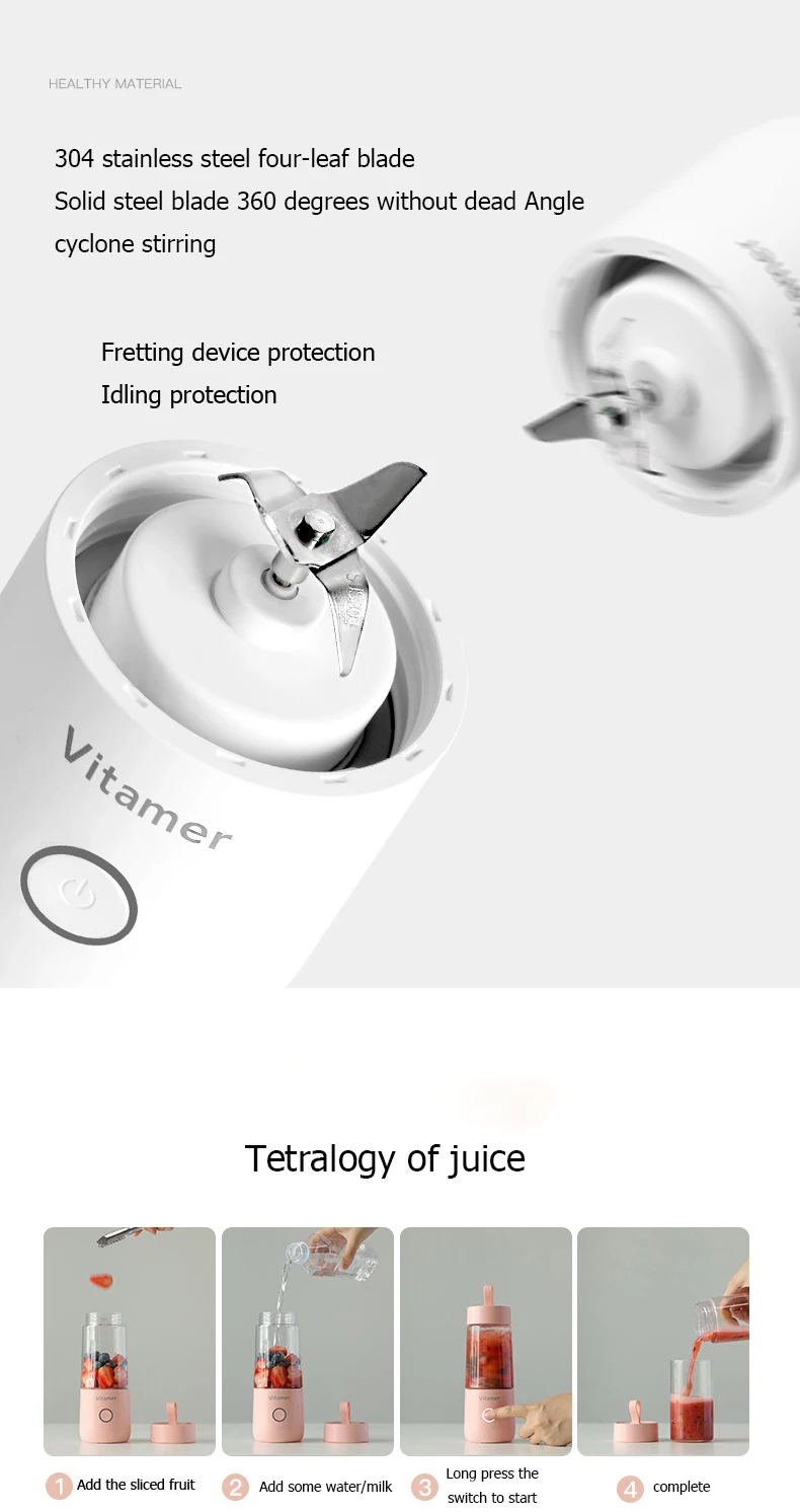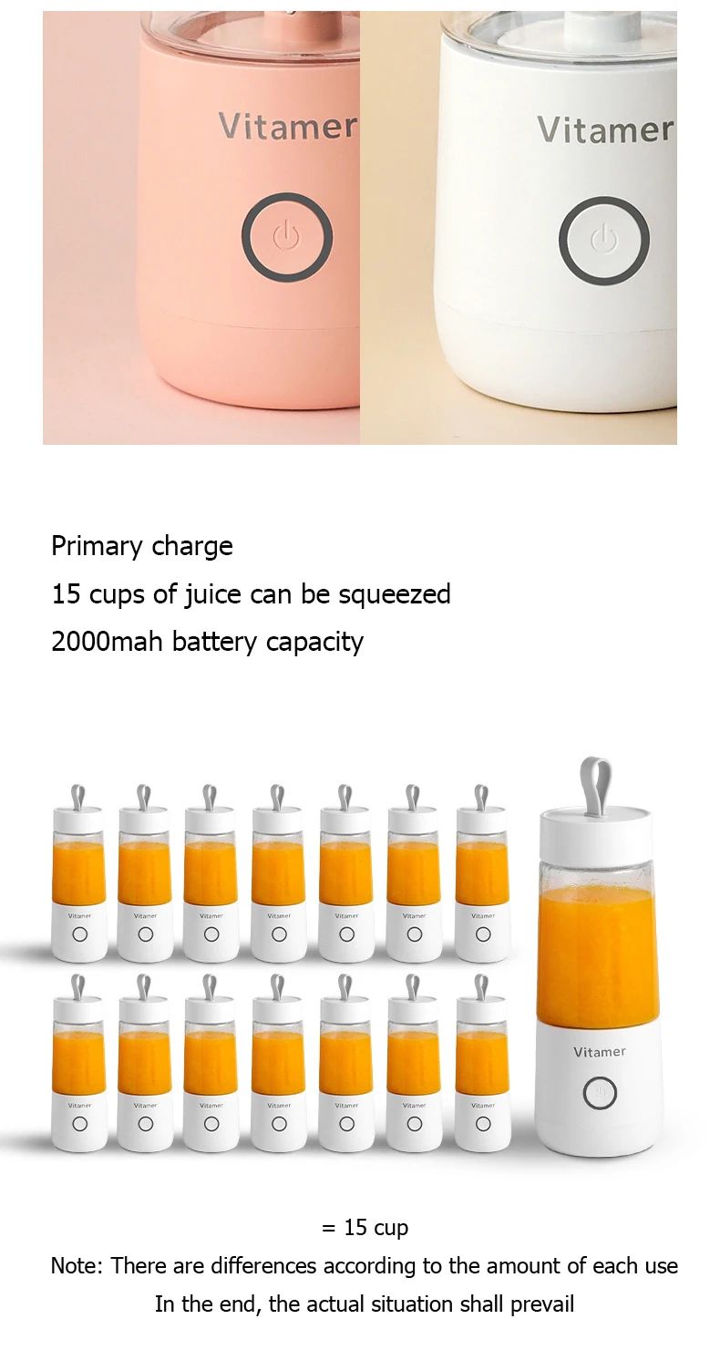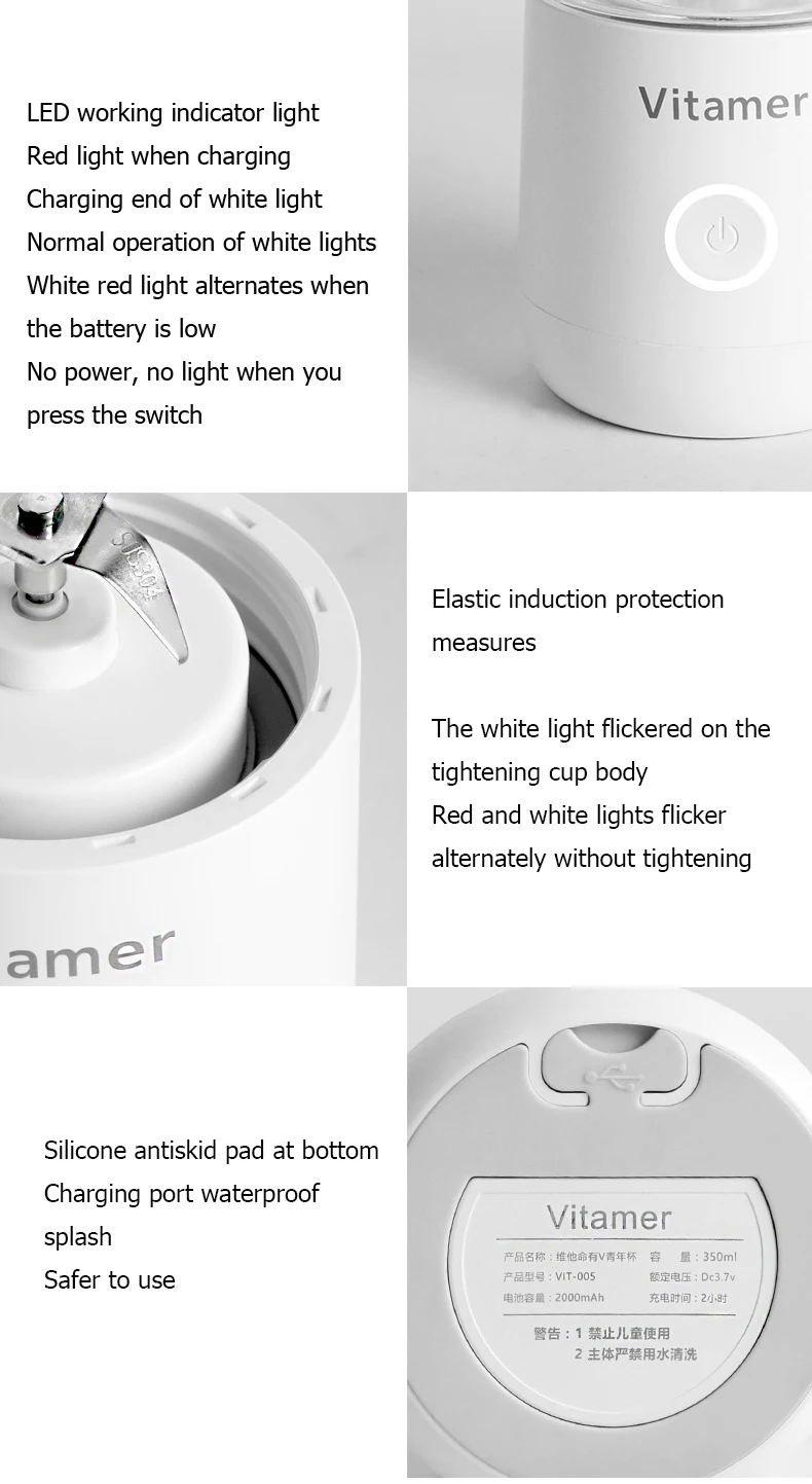 Параметры: Параметры продукта Название продукта: молодежная чашка витамина в Модель продукта: VIT-005 Емкость продукта: 350 мл Номинальная мощность: 65 Вт Время зарядки: 3-4 часа Скорость вращения двигателя: 14000 об./мин. Емкость аккумулятора: 2000 мАч Материал корпуса чашки: акрилонитрил-бутадиен-стирол пластик + тритан Материал лезвия; 304 аустенитная нержавеющая сталь 06Cr19 NI10 Характеристики упаковки: 80*80*210 мм Размер изделия: 78,2*78,2*234 мм Вход напряжения; DC5V Выходное напряжение/ток: DC3.7V Вес нетто: 438 г