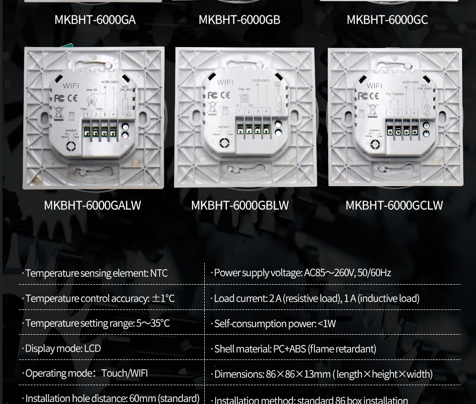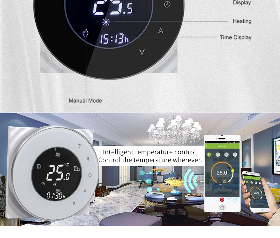 Обратите внимание: > Режим MKBHT-6000GB-B, MKBHT-6000GA-W, MKBHT-6000GC-B не поддерживает функцию Wi-Fi > ModeMKBHT-6000GALW-B,MKBHT-6000GBLW-W,MKBHT-6000GCLW-W поддержка функции WIFI > Серия MKBHT-6000 подходит для центральной системы кондиционирования воздуха, системы электрического напольного отопления, системы водного напольного отопления, системы настенного Бойлера. > Принцип работы: сравнивая температуры в помещении с заданной температуры электрическая нагревательная пленка, греющий кабель Отопление сетка мат, Отопление, плитка, электрический нагревательный привод в конце системы кондиционирования вентилятора катушки блока, электрический клапан, электрическая система отопления, настенный бойлер для открытия и закрытия управления, Для регулировки температуры в помещении, удобная и энергосберегающая цель.