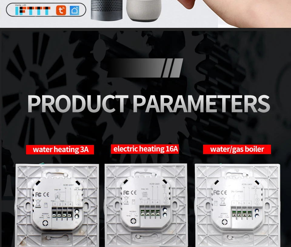 > Цвет: черный/белый > Режим работы: WIFI/Touch > Режим отображения: ЖК-дисплей > Питание Напряжение: AC85 ~ 260 В пер. тока, 50/60 Гц > Само-Потребление: менее 1 Вт > Датчик температуры: NTC > Точность контроля температуры: ± 1 ℃ > Диапазон настройки температуры: 5 ~ 35 ℃ > Температура хранения:-10 ~ 55 ℃ > Рабочая среда: 0 ~ 45 ℃, 5 ~ 95% RH (без конденсации) > Ток нагрузки: 2А (резистивная нагрузка), 1А (Индуктивная нагрузка) > Размеры: 86 × 86 × 13 мм (длина × высота × ширина) > Материал корпуса: поликарбонат + АБС (огнестойкий) > Метод проводки: обжимная Клемма > Проводник площадь поперечного сечения: 0,5 ~ 2.5mm ² > Способ установки: Стандартная 86 установка коробки