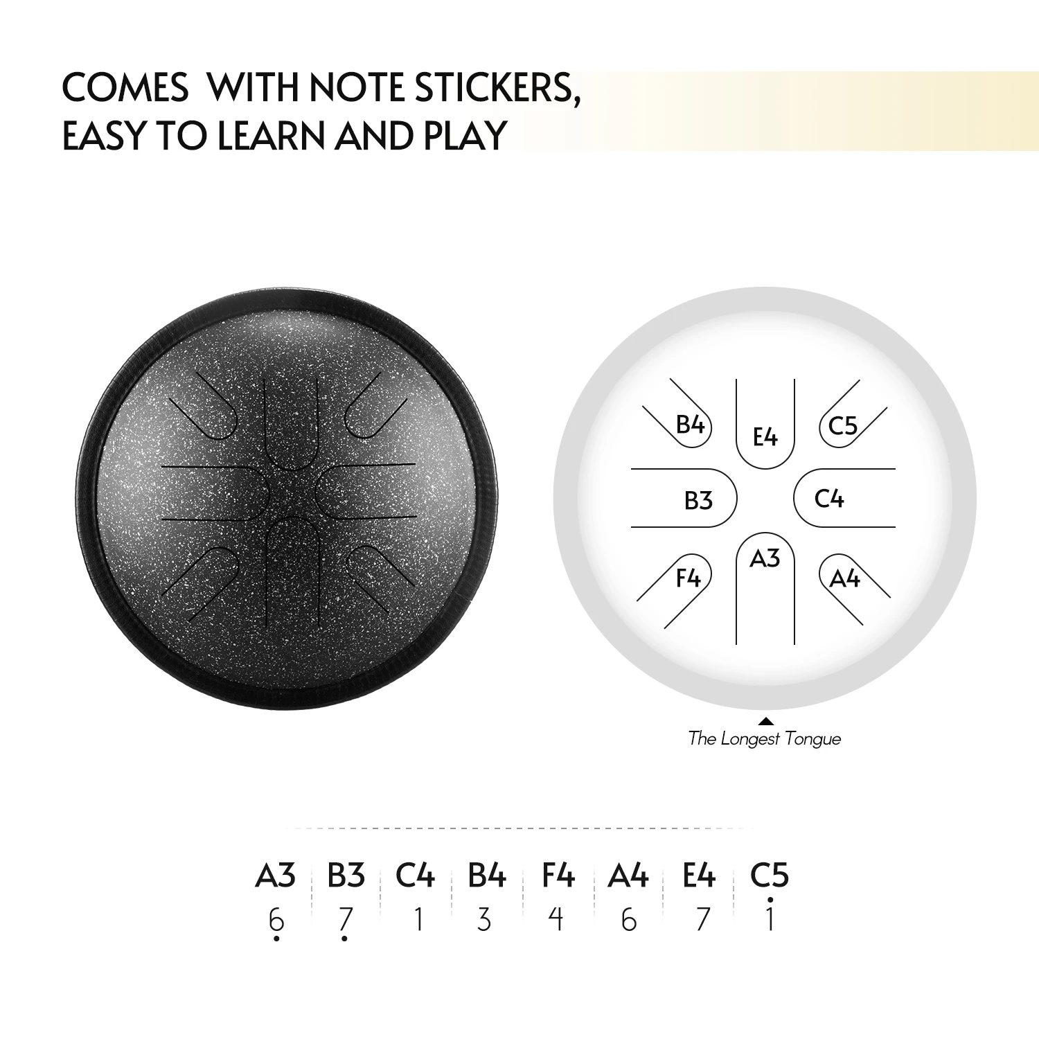 Легко и весело играть:Просто используя молотки или руки, чтобы побить барабанные языки, Даже новички могут играть замечательную музыку, и наклейки облегчат обучение и воспроизведение.