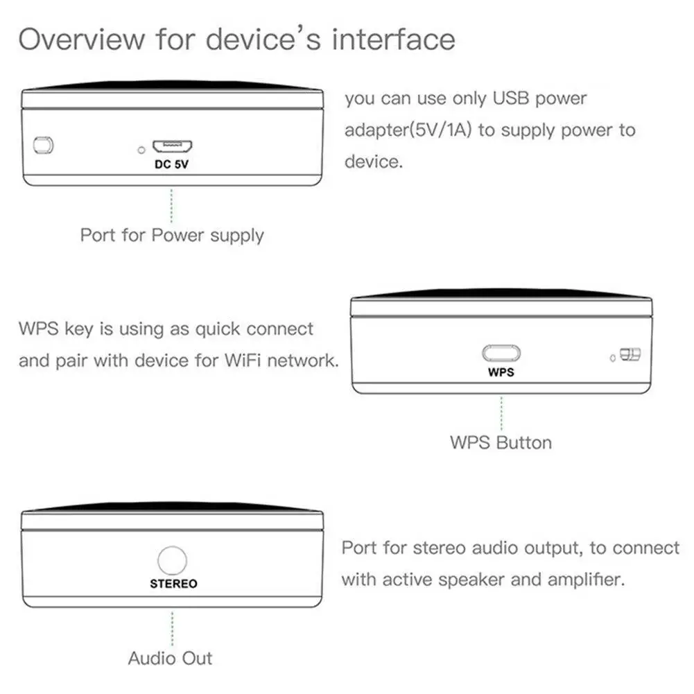 AudioCast M5-это инновационный беспроводной аудиоадаптер, который может превратить ваши текущие колонки, звуковую панель, домашний кинотеатр в беспроводную многокомнатную звуковую систему, подключив к домашней сети Wi-Fi. Специализированное приложение iOS и Android предоставляет самый простой опыт для беспроводной многокомнатной звуковой системы. Кроме того, M5 также предоставляет наиболее мощный вариант воспроизведения, который позволяет передавать синхронизированную музыку или другую музыку с сотового телефона/онлайн-музыкального сервиса/NAS / UPNP сети с удивительным качеством звука в нескольких комнатах.Характеристики M5:Одна кнопка WPS Нажмите для подключения Wi-Fi: Сохраните сложную и проблемную процедуру настройки.Потоковая передача данных с памяти сотового телефона/UPNP сервера/Онлайн музыкальный сервис.Стерео-пара: превратите два M5 в отдельные левый и правый канальный динамики для создания более широкого, большего и более глубокого звука.Специализированное приложение для iOS и Android: Настройка руководства по установке предлагает самый простой опыт когда-либо.Богатый музыкальный сервис: для Sportify, для Pandora, для iHeartRadio, больше поставляется с обновлениями, такими как для Tital, для Dezzer, для GoogleMusic, для Tunein.Беспроводная Многоуровневая и Многоканальная потоковая передача аудио: Drug and play, самая простая система управления несколькими комнатами в мире.Музыкальный будильник с полной настройкой будильника.Автоматическое выключение с полной настройкой.Спецификация M5:WiFi: стандарт IEEE 802,11 b/g/nWi-Fi частота: 2,4 ГГц (Макс 150 Мбит/с) 1T1RWiFi Шифрование: WPA, WPA2, WPA2 смешанныйЧастота дискретизации аудио: 16 бит, 48 кГцАудио SNR: 84 дБДинамический диапазон: 98 дБ THD + N:-85 дБФормат аудиоАудио без потерь:Полный формат APE, FLAC, WAV,Apple LosslessALACMP3: CBR / VBR,32kbps-320kbps AAC:AAC-LC, HE-AAC, HE-AAC v2WMA 48 кГц/16 битПротокол потоковой передачи: DLNA, Airplay, для Spotify connect, для QplayАудиовыход: Аналоговое аудиоМузыкальный сервис:Для Spotify, для Pandora, для Tunein, для iHeartRadioОбслуживание: Google Cast для аудио, для GoogleMusic, для TidalПриложение:Кнопки воспроизведения музыки: воспроизведение/пауза все/воспроизведение всех/Next/последнее/управление громкостью/Избранное/Список файлов/Airplay(DLNA)Режимы воспроизведения: перетасовка, ПовторИсточники воспроизведения: память сотового телефона/UPNP сервер/Онлайн музыкальный сервисСписок воспроизведения: Список избранных/список воспроизведения/рядом игратьСписок музыки: песня/Художник/альбом, цвет приложения динамически меняется с цветным стилем альбомаПредварительный набор номеров плейлист: 6 программного обеспечения предварительно установленный канал, источник может быть локальный или Онлайн музыкальный Плейлист, позволяет воспроизводить плейлист с помощью чисел внизуФункция поиска:Многофункциональная функция синхронизирует музыку или другую музыку с несколькими динамиками.Режим контроля над лекарствами и играми, самый простой способ контролировать когда-либо.Управляйте всеми динамиками, проигрывайте песни, громкость, быстрый вперед, назад вперед, Переключайте, играйте одновременно, делайте паузу.Стерео пара: Поворотная колонка с одним левым или правым каналом. Сделайте два M5 раздельными левыми и правыми динамиками для создания более широкого, большого и более глубокого звука.Настройка устройства:Время автоматического отключения питания: обратного отсчета: 10 минут/20 минут/30 мин