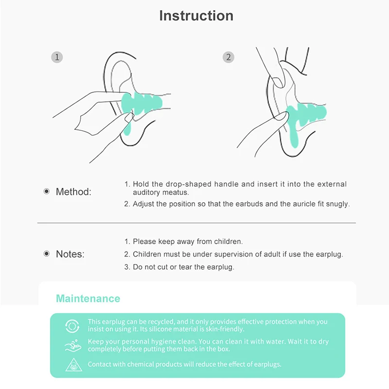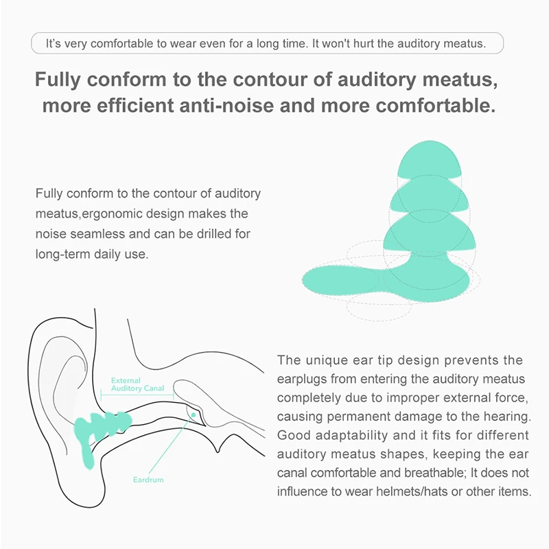 Совершенно новый и высокое качество. Форма рождественской елки уменьшает давление на ушной канал, подходит для длительного ношения. Подходит для различных форм ушного канала для длительного сна, не вызывая дискомфорта в ушах. Может использоваться повторно без деформации. Способ ношения: аккуратно Вытяните верхнюю часть уха, выровняйте Заушник с ушным каналом и аккуратно поверните его в подходящее положение, чтобы убедиться, что воздух в ушном канале не общается с атмосферой. Этот продукт может быть использован повторно и очищен.