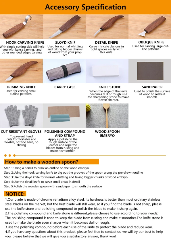 Хороший инструмент: Этот набор инструментов для резьбы по дереву включает нож для резки, резак для крючков. Универсальный резак, точилка, нож, камень, перчатки, воск, мешок, необработанная деревянная ложка, наждачная бумага