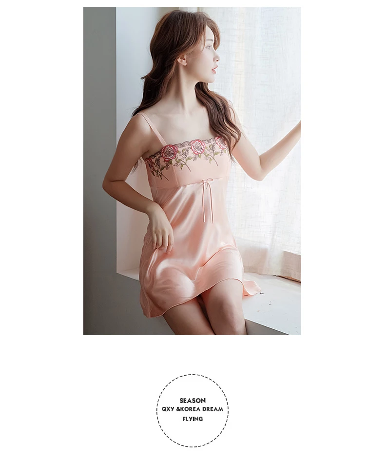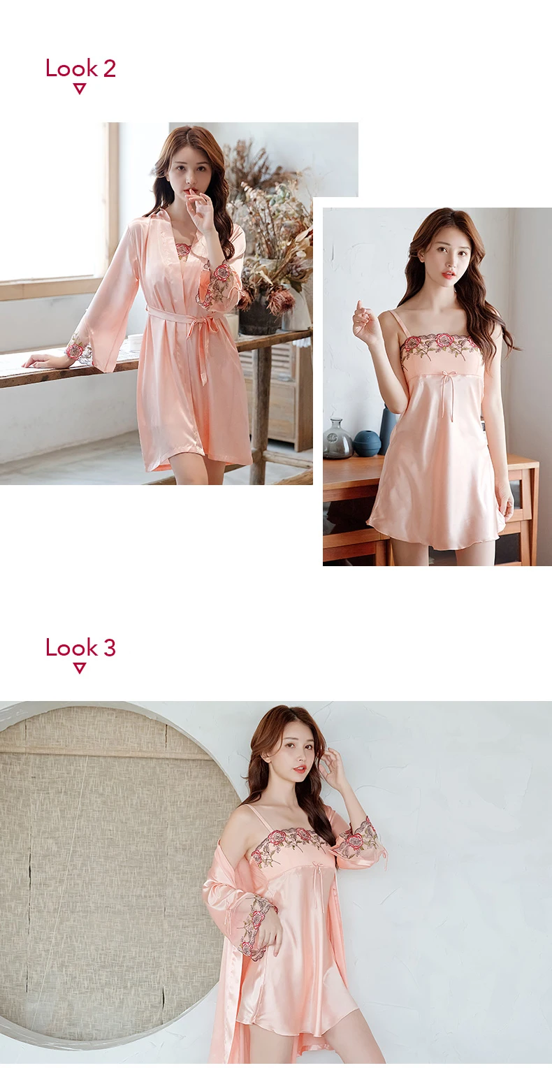Женские ночные рубашки из искусственного шелка, комплект из двух предметов, ночная рубашка с длинными рукавами и вышивкой, Женский 2701