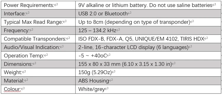 Обзор RT 100-это удобный ручной RFID тег-сканер для низкочастотных тегов, включая FDX-B тегов, используемых для маркировки домашних и сельскохозяйственных животных. Он популярен среди ветеринаров. Он компактный, но имеет отличную производительность с расстоянием сканирования от 5 до 8 см в зависимости от используемой бирки и ее ориентации на сканер. RT100 имеет встроенную память, способную удерживать до 1000 идентификаторов для более поздней передачи в хост-систему. Подключение возможно через одну из двух звеньев; RT100 доступен с USB или с Bluetooth-подключением. Версия USB включает usb-кабель. Он может считывать транспондеры типа FDX B (стандарт ISO), типа FDX A (Destron, AVID, AEG) и HDX (Texas Tiris).