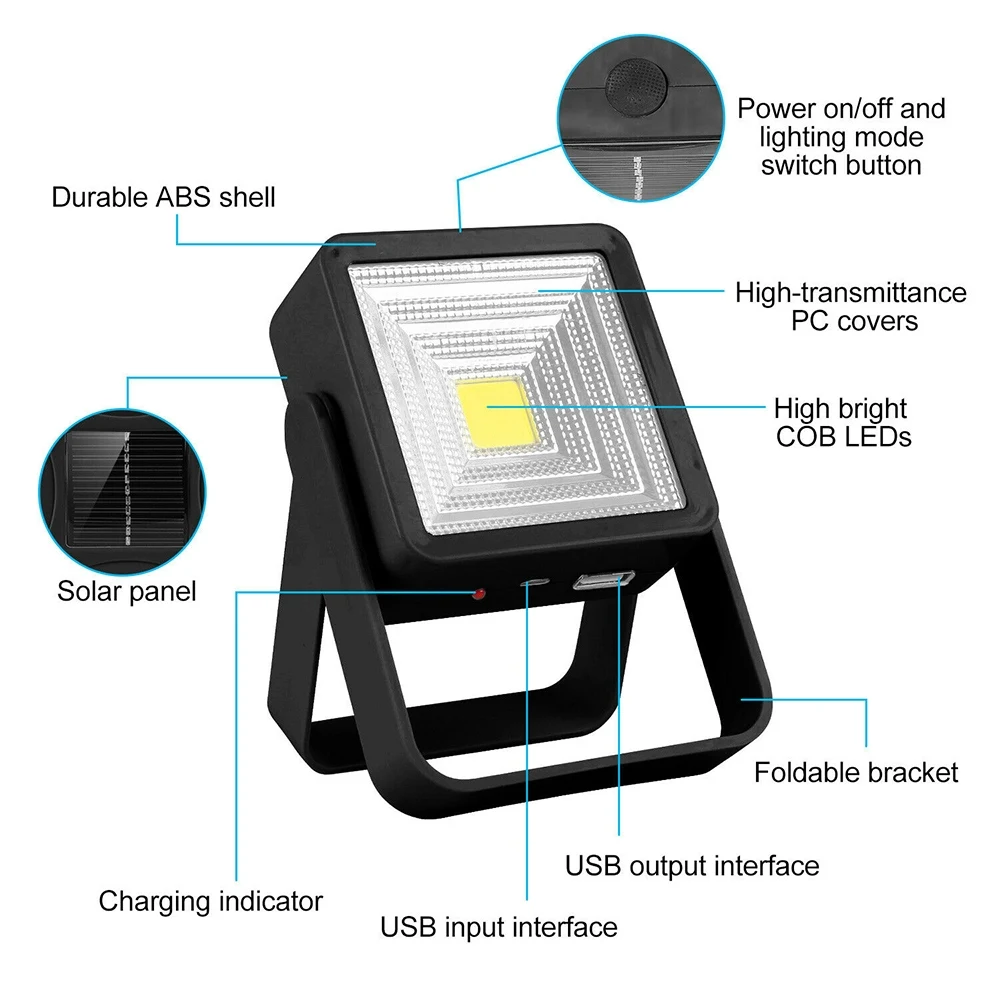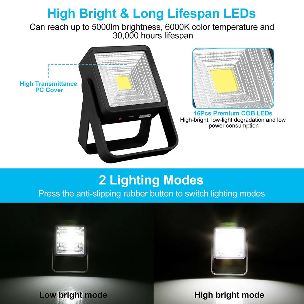 1. Высокая яркость и длительный срок службы светодиодный S: принятие 16 шт. высокий-яркий, низкий-светильник разложения и низкое энергопотребление COB светодиодный s, наш светодиодный светильник может достигать до 5000лм яркости, цветовая температура 6000K и срок службы 30 000 часов. 2. Высокий и низкий светильник Режимы работы: в верхней части Светильник поставляется с противоскользящей резиновой кнопкой, и вы можете нажать на нее, чтобы переключить режим освещения от высокой яркости и низкой яркости. И вы можете вращать светодиодный светильник на 360 ° для регулировки угла освещения в соответствии с вашими потребностями. 3. Питание от солнечной энергии и зарядка от USB: сзади наш светильник, вы увидите 2.09in x 2.05in поликремниевая солнечная панель с 17% электро-оптическим ex, чтобы зарядить светильник. Кроме того, наш светильник также может быть заряжен кабелем micro USB в чехол плохой погоды. 4. Аварийная Рабочая лампа и внешний аккумулятор: Может использоваться в качестве аварийных огней для обработки некоторых чрезвычайных ситуаций, таких как отключение, ремонтные работы и т. д. И поставляется с интерфейсом USB для зарядки ваших смартфонов, чтобы работать в качестве аварийного внешнего аккумулятора. 5. Портативный размер со складной подставкой: его размеры 3,54x1,3x4,88 дюйма (Д x Ш x В) Внешние размеры позволяют легко поместить его в рюкзак. И он имеет складную подставку с сильным магнитом, который можно повесить на крючки и закрепить на любой железной поверхности.