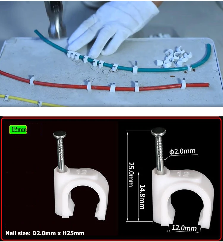 Товар: круглые зажимы для ногтей Материал: ПЭ пластик + гвоздь Размер: 12 мм, 14 мм, 16 мм, 18 мм Упаковка: 100 штук в пакете Посылка включает: 100 шт./упак. кабельные зажимы. Для оптовых или оптовых заказов, пожалуйста, свяжитесь с нами для получения предложения. Спасибо. Примечание: 1. Возможны отклонения в размере +/-0,5-1 мм из-за измерений вручную. 2. Количество 100 штук в пакете рассчитывается путем взвешивания, а не вручную.