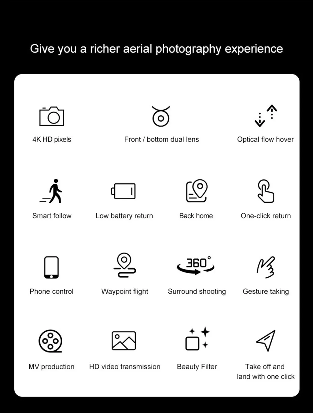 Вверх/вниз, вперед/назад, Левый/правый, боковой f светильник, уровень 3 f светильник скорости, светодиодный светильник, следуй за мной, Полет вокруг, полет в waypoint, режим ожидания высоты, Безголовый режим, один Кнопка возврата, одна кнопка взлета/посадки, wifi fpv, камера/видеоПосылка включает в себя:
