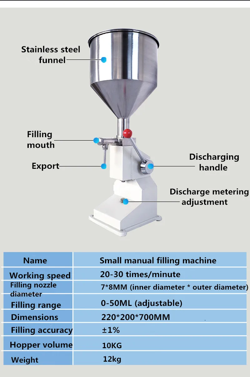 Режим работы: руководство Рабочая скорость: 20-30 ударов/мин Диапазон заполнения: 5-50 мл (внешняя ручка, регулируемая) Точность заполнения: ± 1% Вместимость бункера: 10 кг Размер: 220*200*700 мм Вес: 13 кг