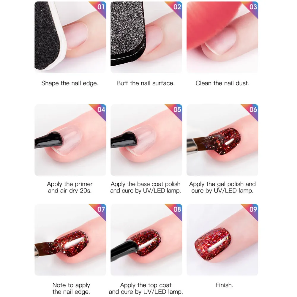 Шаг наращивания ногтей: 1. Нанесите Базовое покрытие, вылечите светодиодный/УФ-лампа. 2. Нанесите форму ногтя на ваш ноготь. 3. Возьмите достаточно акриловой жидкости для чашки. 4. Нанесите акриловый порошок акриловой жидкостью на гвоздь. 5. Нанесите его на ноготь. Подождите, пока он высохнет. 6. Снимите форму ногтя. 7. Обрежьте форму ваших ногтей. 8. Нанесите верхнее покрытие, вылечите светодиодный/УФ-лампой. 9. Отделка.