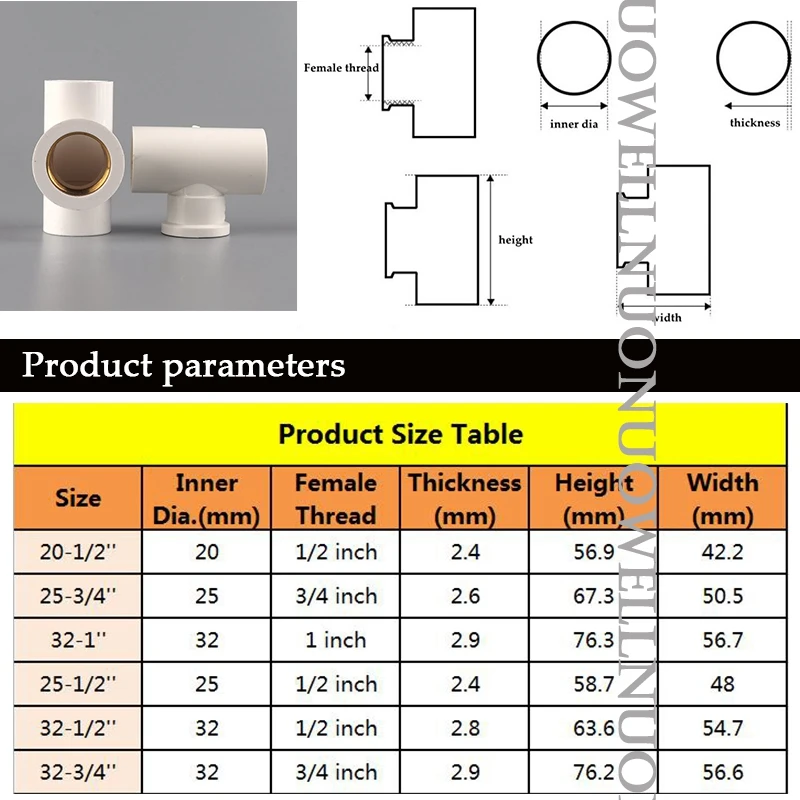 -Название: ПВХ труба медная Женская резьба Тройник -Материал: пластик -Цвет: белый, серый, синий -Размер: 20*1/2'' 25*3/4'' 32*1'' 25*1/2'' 32*1/2'' 32*3/4 ''и т. д. (пожалуйста, свяжитесь с нами для другого размера) -Применение: ①Соединитель к ПВХ-трубке для расширения трубы ②Ремонт труб и т. Д. ③ Подключение труб в разных направлениях