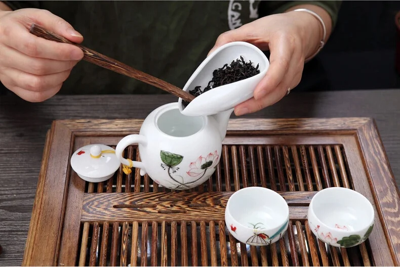 El Cha él es un soporte para hojas de té suelto cuando se los muestra a los invitados o para su uso como herramienta de medición durante la preparación del té. Coloque las hojas secas antes de ponerlas en la tetera para su developación.