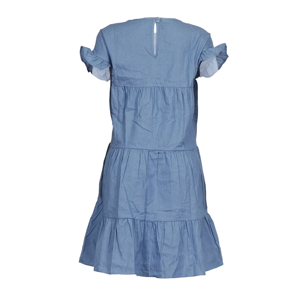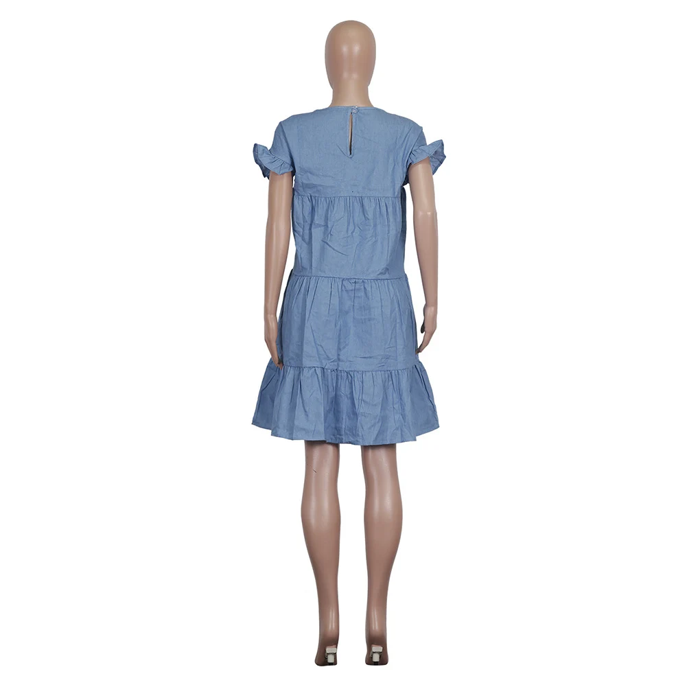 Повседневное женское джинсовое ТРАПЕЦИЕВИДНОЕ ПЛАТЬЕ с круглым вырезом, коротким рукавом и оборками на спине