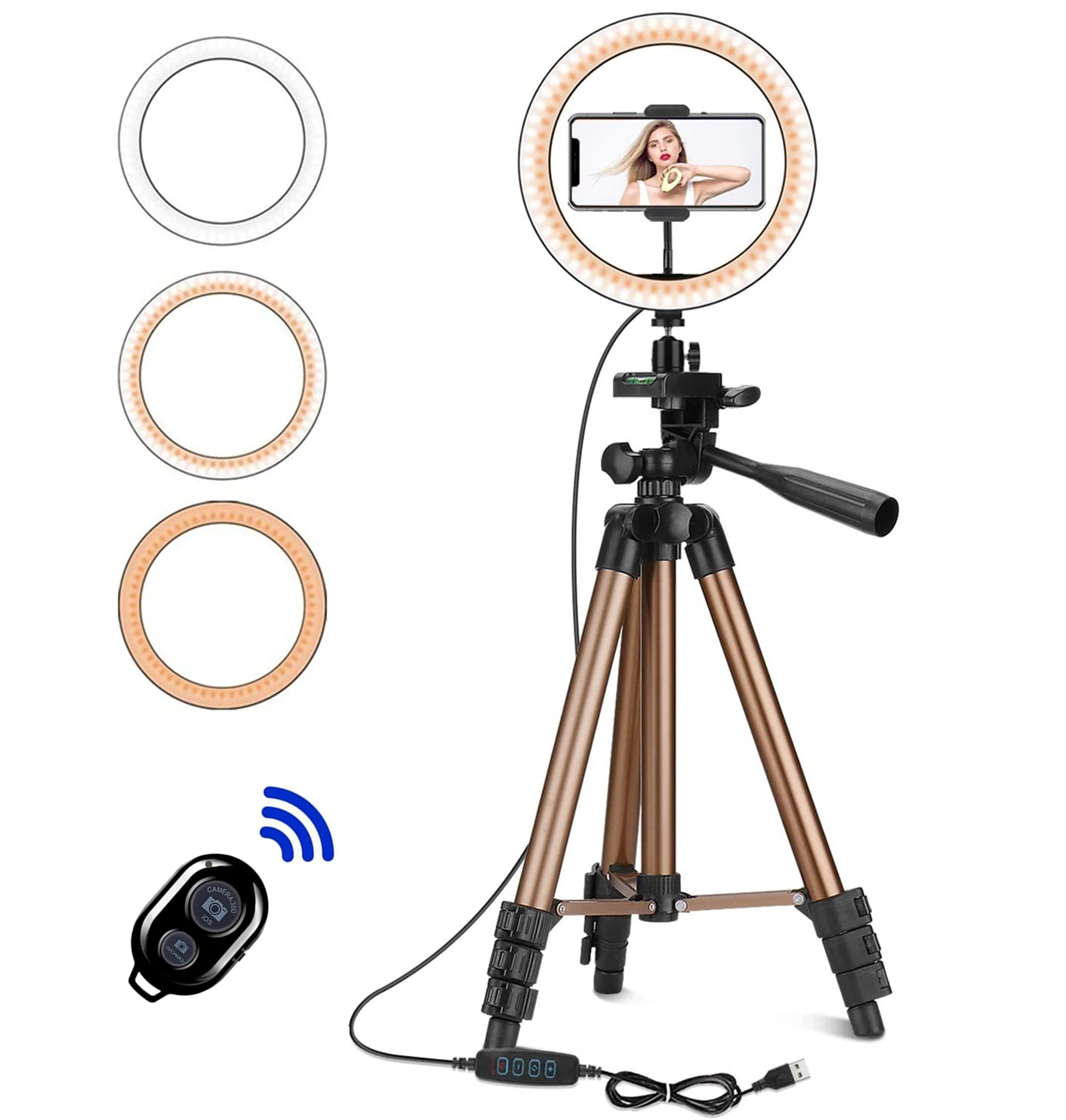 Кольцевой светильник подробнее о продукте: Потоковое вещание светодиодный поток светильник Три светильник режимов (белый, теплый белый, теплый желтый) Устойчивый Штатив с противоскользящей ножкой 10 освещение Яркость уровней Универсальный держатель для мобильного телефона (2,36 "до 3,35" в ширину) Регулируемая высота стойки (от 14 до 47 дюймов) Быстрая и простая сборка, разборка Штатив Технические характеристики: Модель: WT3130 Материал: Алюминий из алюминиевого сплава Длина в сложенном виде: 42 см Максимальная высота штатива: 125 см Количество столбцов: 4 секции Грузоподъемность: 2,5 кг/5.5Lb Вес изделия: 522 г/1,15 фунтов Посылка Размер: 9*9*43 см для ухода за ребенком для мам/3,5*3,5 * 16.9in Посылка, вес: 640 г С дистанционным управлением по Bluetooth инструкции по уходу за изделием Пожалуйста, обратите внимание, что пульт дистанционного управления не включает батарею 1. Нажмите кнопку питания, светодиодный мигающий; 2. После включения, нажмите клавишу сопряжения bluetooth, светодиодный индикатор мигает медленно. Шаги bluetooth до состояния, которое можно искать и сочетать; 3. Используйте мобильные телефоны для соответствия. Светодиодный индикатор будет выбран после успешного сопряжения; 4. Нажмите соответствующую клавишу конфигурации. Светодиодный светильник после настройки. Продукт может использоваться обычно в это время. 5. Без использования в течение пяти минут продукт автоматически войдет в спящее состояние. Пожалуйста, нажмите кнопку питания, чтобы выключить таймер, когда он не используется, чтобы убедиться, что аккумулятор используется для длительного времени. 6. Может заряжаться с ПК устройств или мобильных адаптеров питания. Светодиодный on --- зарядка. Светодиодный выход --- насыщенность. Посылка включает в себя: Пожалуйста, посмотрите на картинку