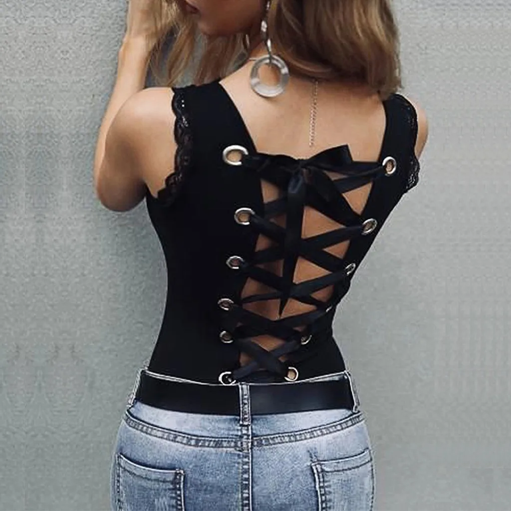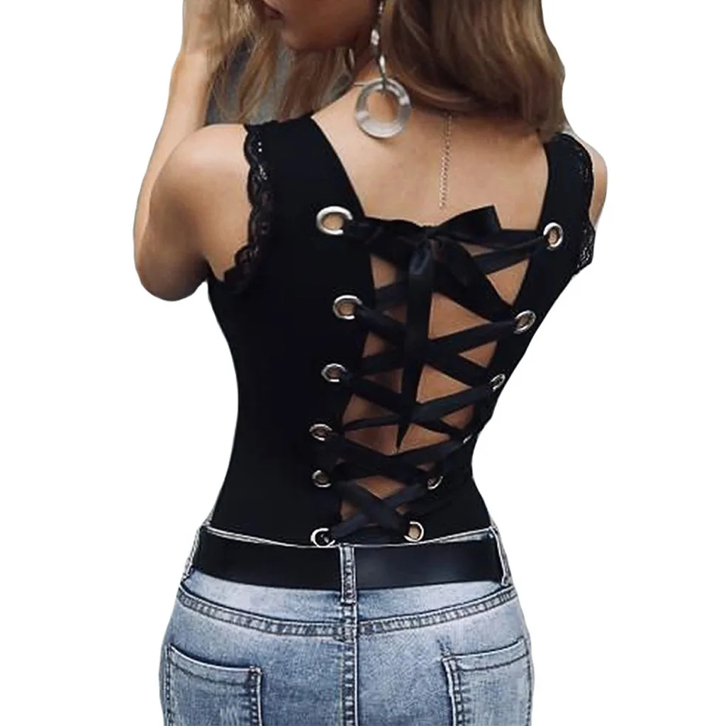 Women Sleeveless Pure Colour O-Neck Bandage Hollowing Out Tops T-Shirt Blouse