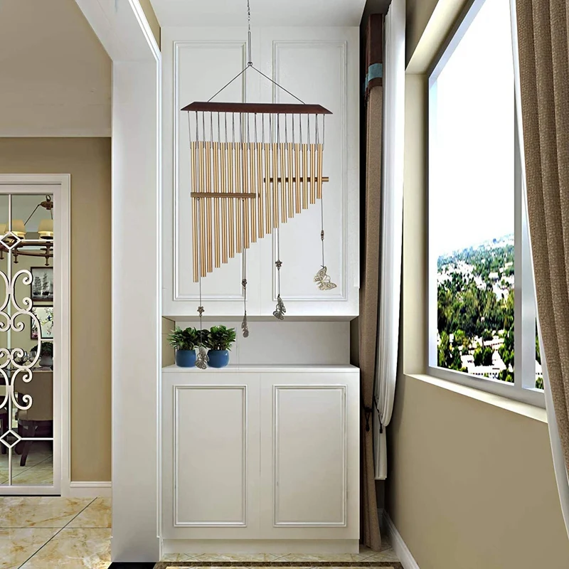 Общая длина составляет 29 дюймов, ширина составляет 12 дюймов, длина 20 медного цвета алюминиевые трубы 4,4 до 11 дюймов, и бабочки ветра Ловца 1,6 дюйм (ов). Это средний размер колокольчика ветра, подходит для большинства помещений.