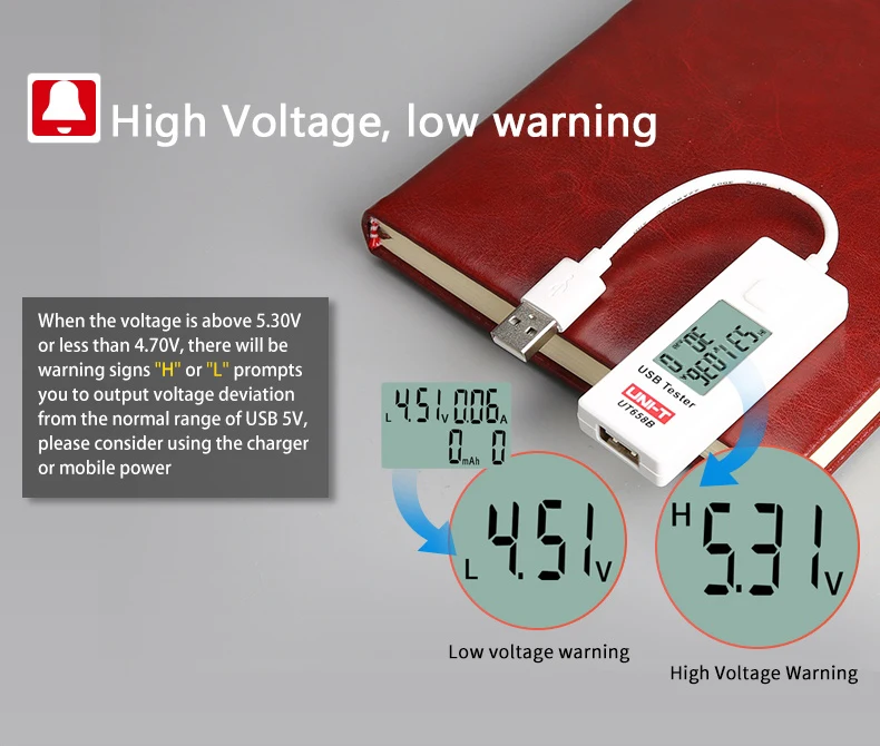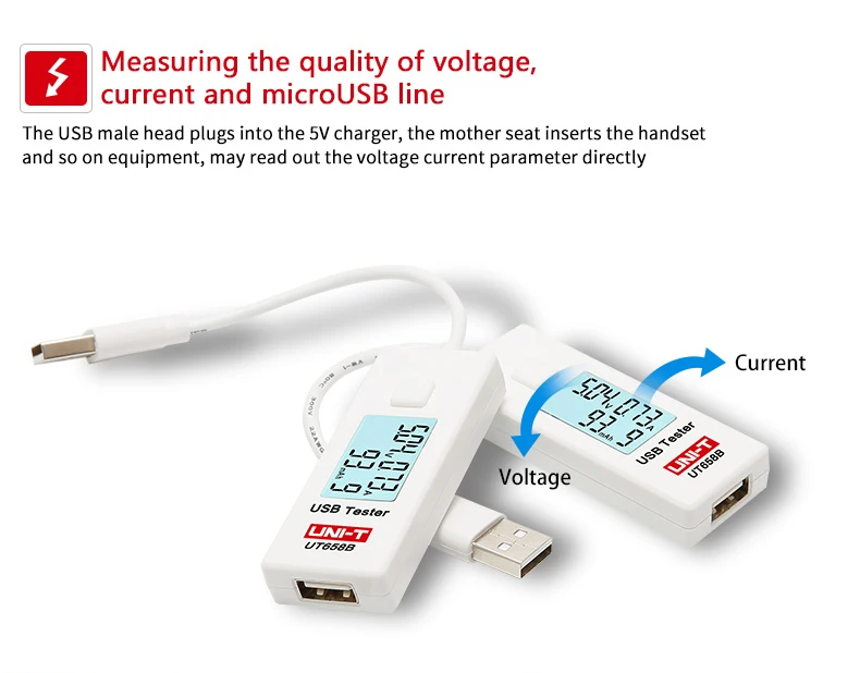 UT658 серия 9VUSB тестер используется для проверки USB зарядное устройство и портативный источник питания электронных продуктов. UT658 может выходное напряжение, ток и мощность. Используйте rs, чтобы отслеживать состояние зарядки любого устройства с питанием от USB.