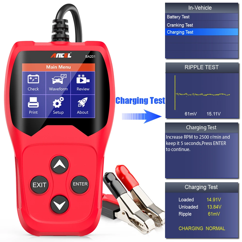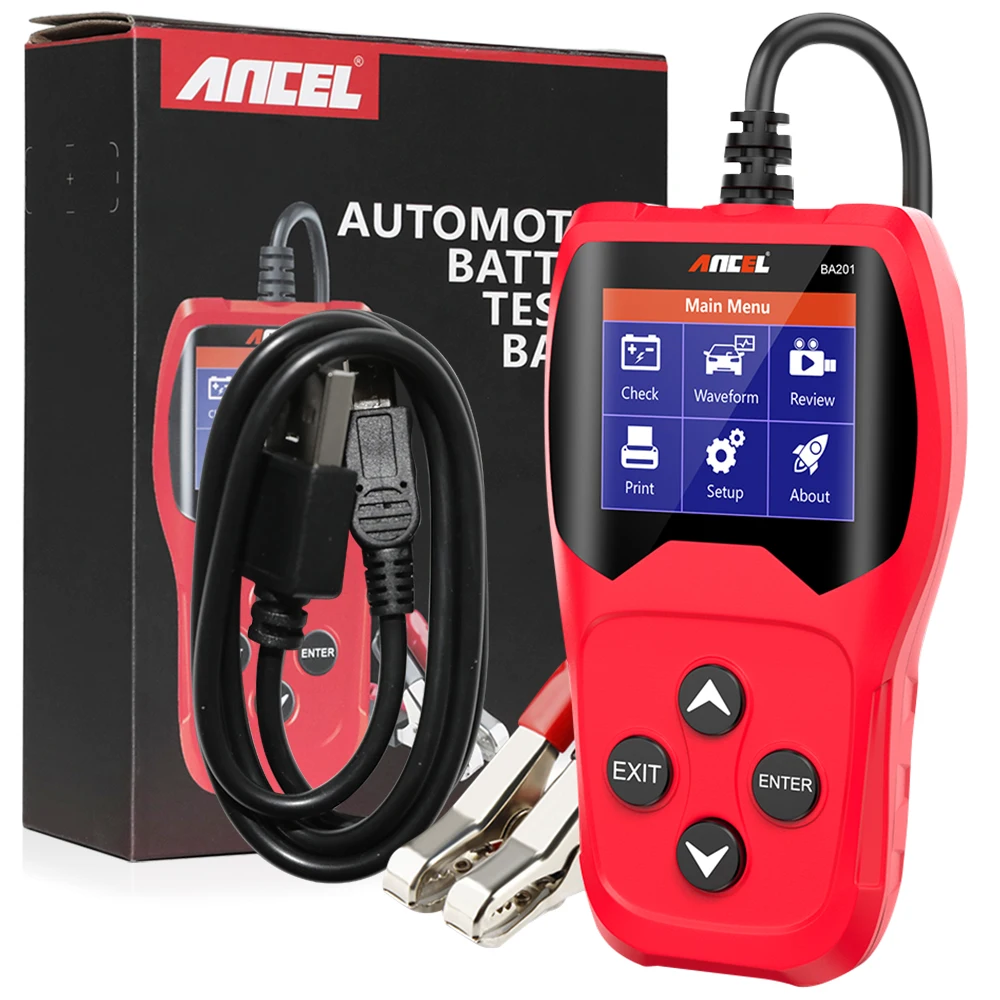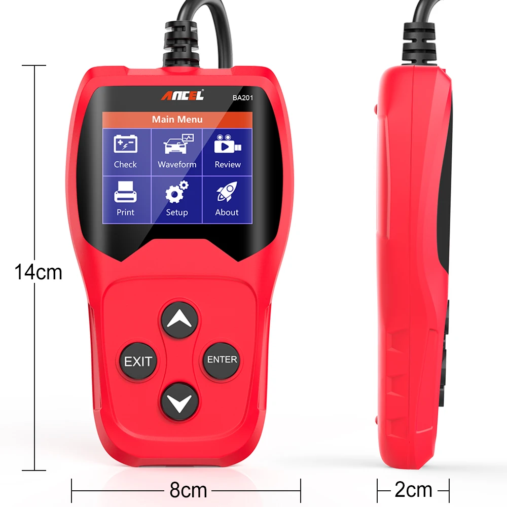 Ancel BA201 тестер батареи используется для 12V 100-2000CCA 3-220Ah свинцово-кислотный пусковой батареи, вместе с проверкой следующих условий загрузки напряжения батареи, запуска и зарядки. Благодаря очеловечиванию дизайна, простоте в эксплуатации, точному считыванию, полным функциям этот тестер обеспечивает показания большим цветным цифровым ЖК-дисплеем и индикатором волны при тестировании. И Поддержка многоязычного чтения данных и печати с помощью ноутбука, так что это лучший инструмент в области продаж аккумуляторов, ремонт автомобилей и проверка батареи в системе оборудования, связанных с свинцово-кислотным пусковым аккумулятором.