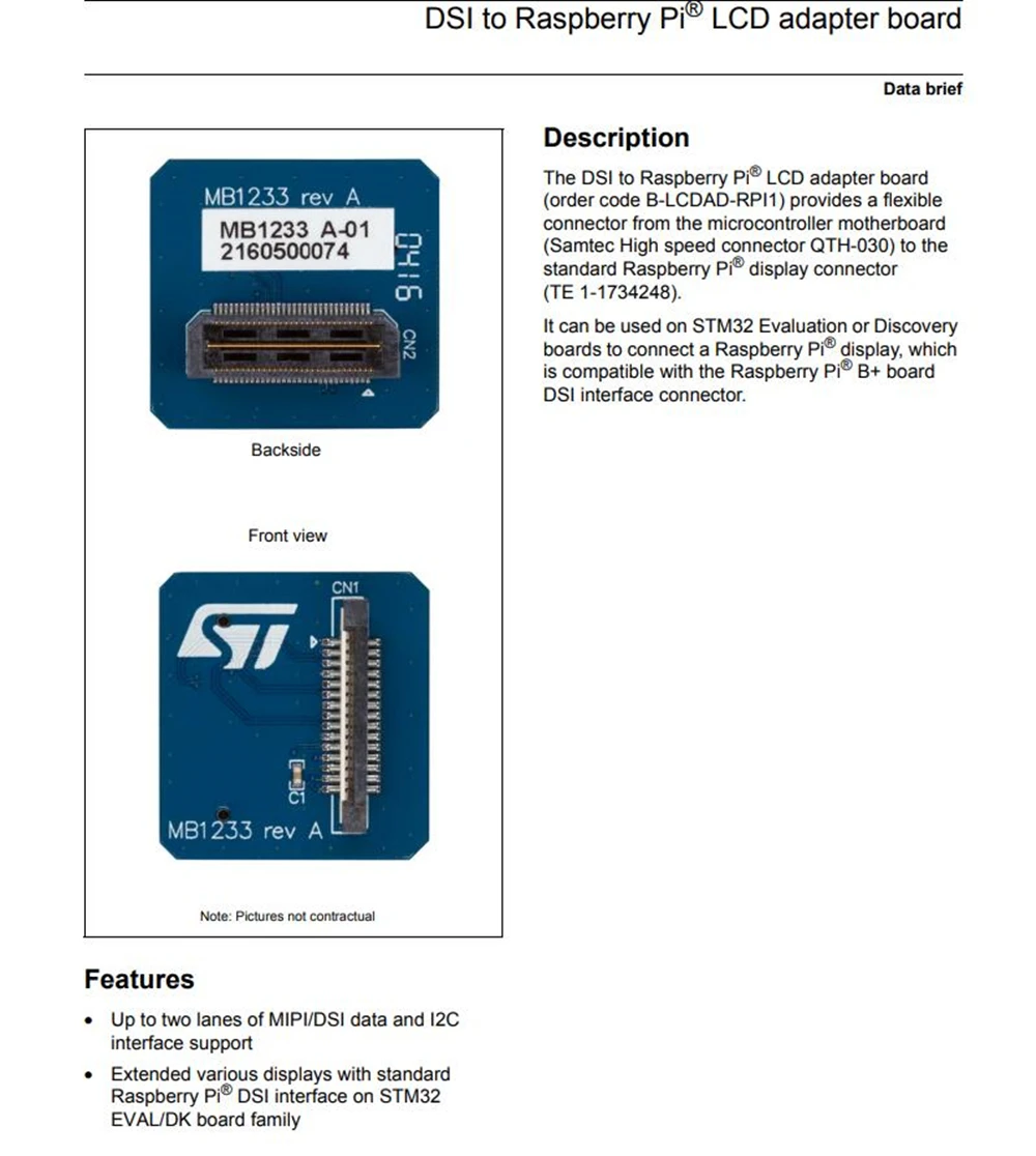 B-LCDAD-RPI1-это 15pin Однорядная Гибкая плата адаптера DSI с печатной схемой. Эта плата адаптера DSI к Raspberry Pi LCD обеспечивает гибкий разъем от материнской платы микроконтроллера (samtec Высокоскоростной разъем QTH-030) к стандартному разъему дисплея Raspberry Pi (TE 1-1734248). Он может быть использован на STM32 оценке или доске обнаружения для подключения Raspberry Pi дисплея, который совместим с Raspberry Pi B + плата DSI разъем интерфейса. До двух полос данных MIPI/DSI и поддержка интерфейса I2C Расширенные различные дисплеи со стандартным интерфейсом Raspberry Pi DSI на STM32 EVAL/DK board family Приложений Встроенный дизайн и разработка