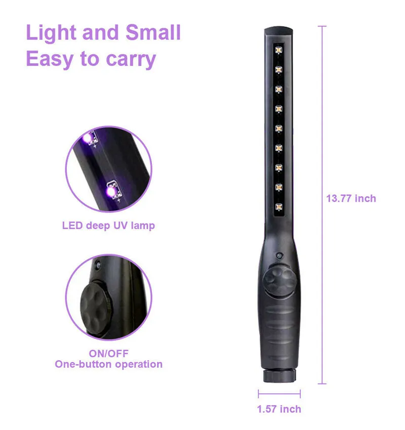 Материал: пластик + светодиодный Мощность: 4 Вт; Светодиодный: 9 шт. Вход: 5 В постоянного тока; Режим питания: USB Время стерилизации: 5-10s Лучшее расстояние стерилизации: 1-5 см; Срок службы: ≥ 20000 ч; Время работы: Непрерывное использование в течение 4 часов; Длина УФ-волны: 270-280 нм; Время зарядки: около 1,5 часов; Размер изделия: 350*40*35 мм; Вес изделия: 144 г.