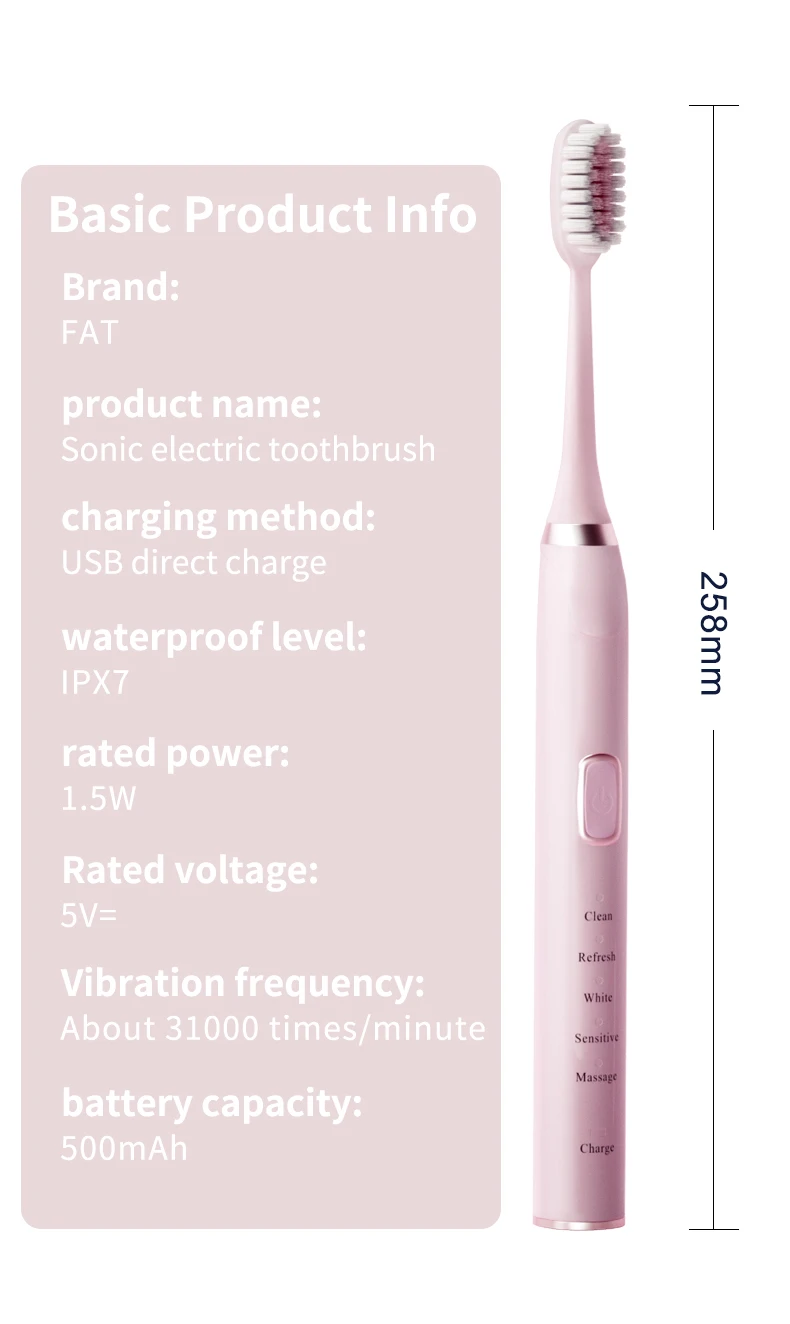 ● Номер модели: FAT T8 ● 5 режимов: режим очистки, режим обновления, белый режим, сенсационный режим, режим массажа ● Емкость аккумулятора: 500 мАч ● Метод зарядки: зарядка через USB ● Уровень водонепроницаемости: IPX7 ● Головки кистей: 5