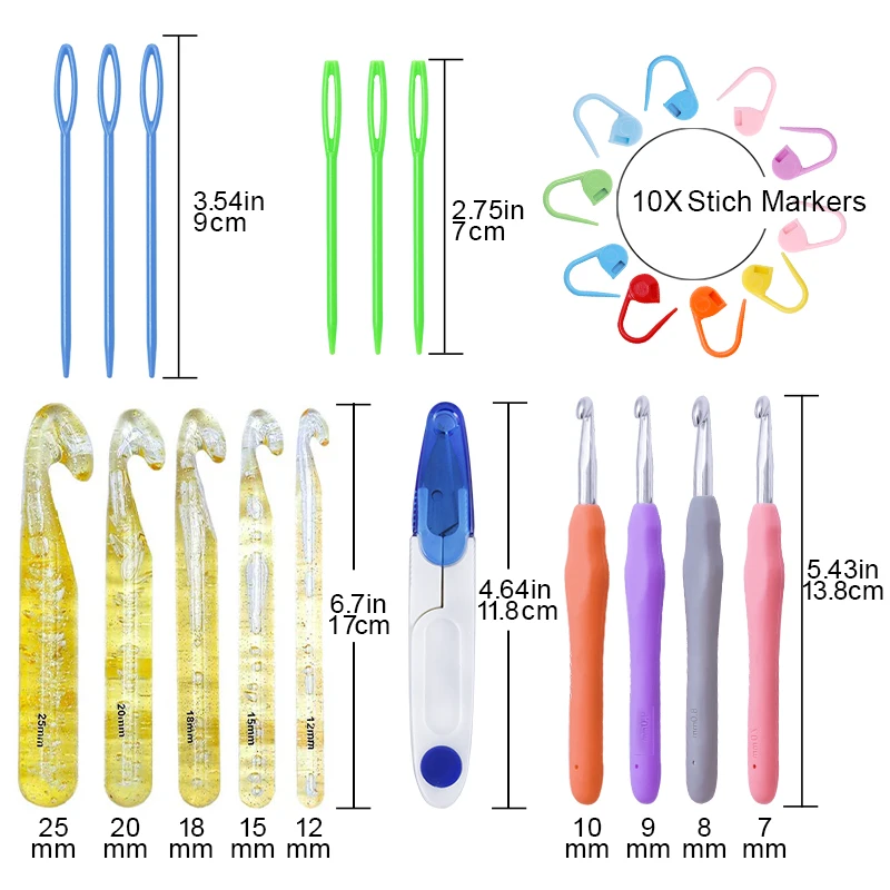 Компактный крючком полный комплект включает желтый Джамбо крючком крюк в 5 размеров, 12 мм, 15 мм, 18 мм, 20 мм, 25 мм, алюминиевый крючком крюк в 4 размерах, 7 мм, 8 мм, 9 мм, 10 мм и другие принадлежности для вязания крючком, ножницы для пряжи, чехол для вязания спиц, 10 шт. маркеры для вязания крючком, 6 спиц для вязания. Размер отмечен на ручке для идентификации и удобства использования. Отлично подходит для вязания крючком из громоздкой массивной пряжи очень быстро, идеально подходит для новичка, потому что легко подсчитывать цепные швы, легко видеть, что вы делаете. Большие иглы для шитья глаз хороши для работы с вязальной нитью, чтобы вплести хвосты в швы, маркер для стежков изготовлен из высококачественного пластика, мягкий, гибкий, прочный и легко сгибаемый, но никогда не вырывается. Мы предоставляем удобные Сумки для хранения, вы можете использовать их для хранения ваших маленьких аксессуаров для вязания крючком без беспорядка.