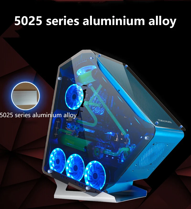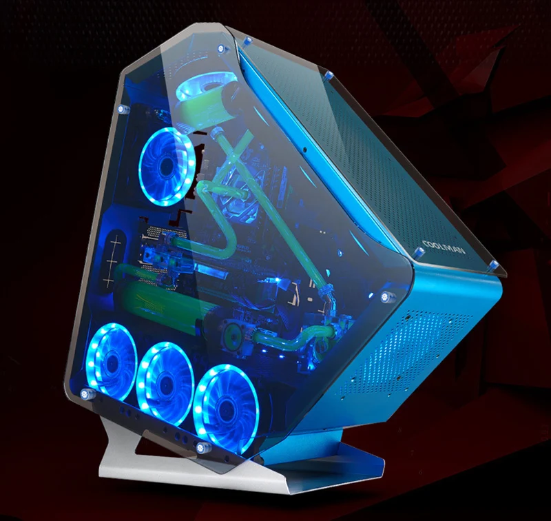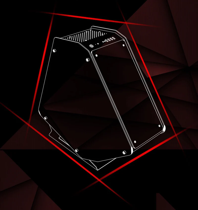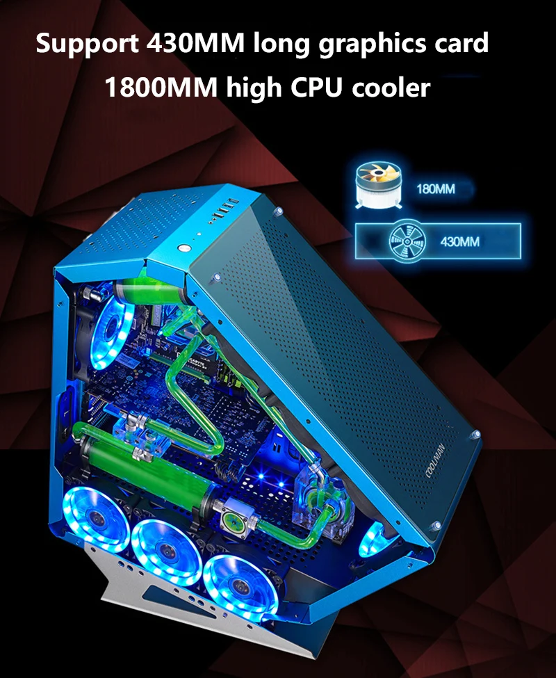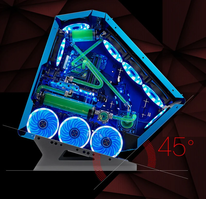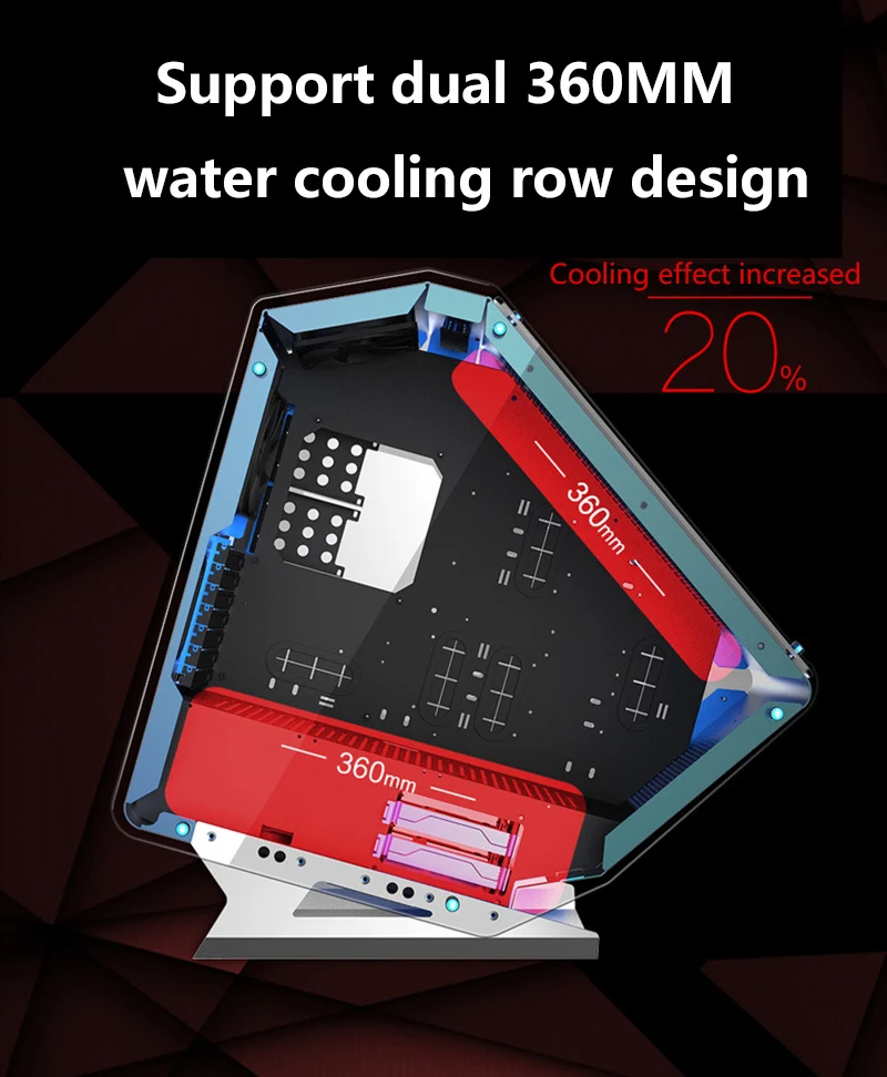 Характеристики продукта: пятисторонний металлический алюминиевый корпус в форме бриллианта, конструкция коробки с водяным охлаждением ∠ 45 °, поддержка длинной графической карты 430 мм, поддержка 2Штук 360 мм с водяным охлаждением