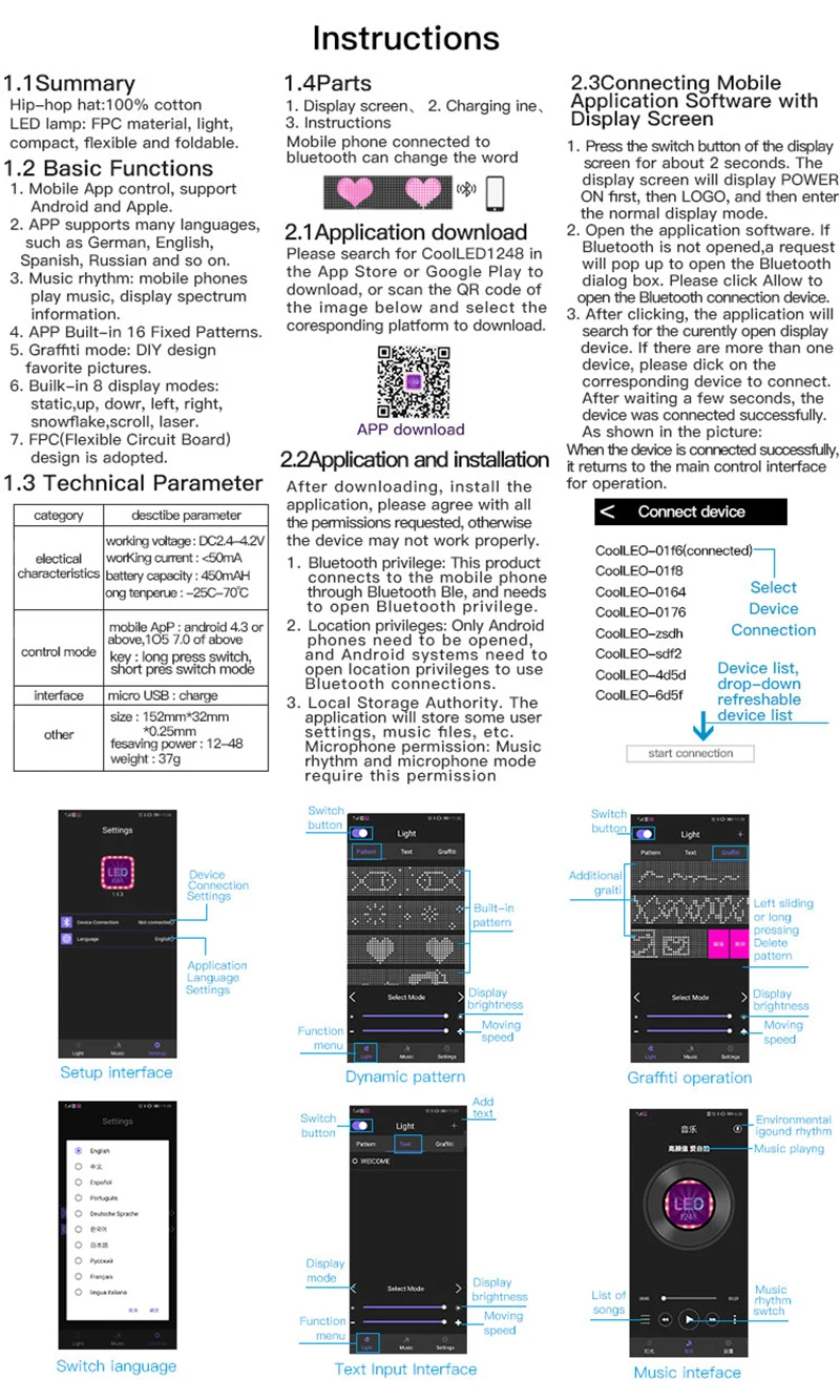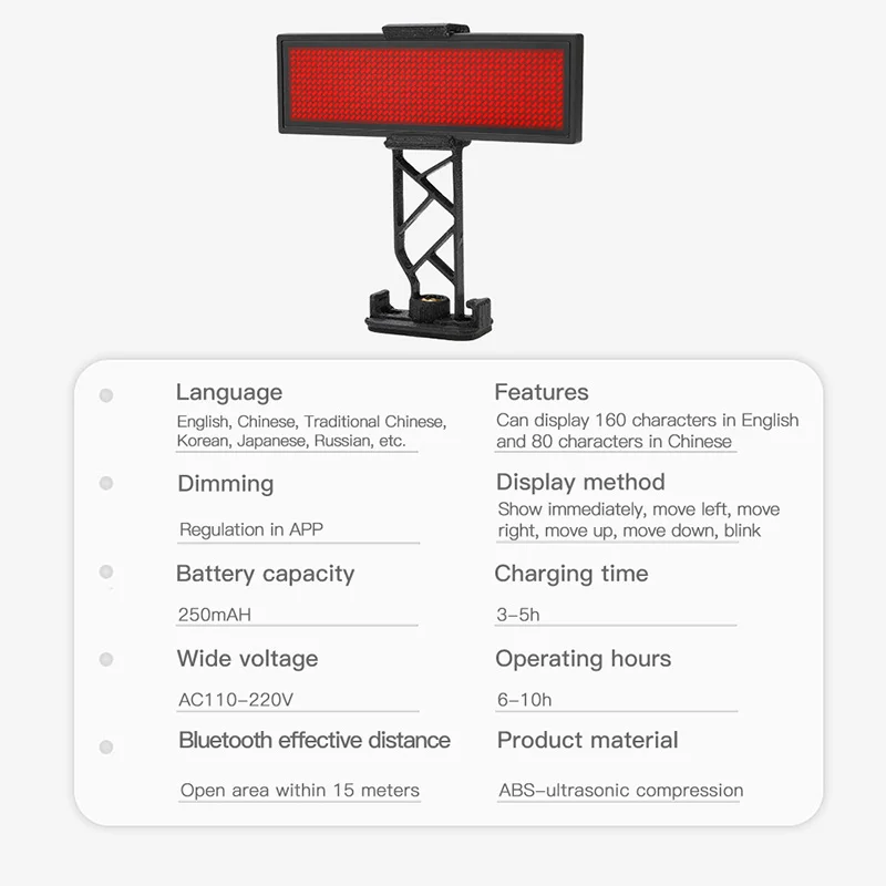 Описание: Характеристики: 1. Поддержка нескольких языков и узоров. 2. Может отображаться до 160 английских символов. Материал: АБС-пластик и Резина Размеры: 9,3x2x8,6 см Вес: 52 г Яркость: Регулировка яркости в приложении Режим отображения: перемещение вверх/вниз/влево/вправо/вспышка Емкость аккумулятора: 250 мАч Напряжение: AC110V-220V Время зарядки: 3-5 часов Время работы: 6-10 часов Расстояние управления Bluetooth: до 15 м в открытом пространстве Отправить список: 1 комплект * дисплей